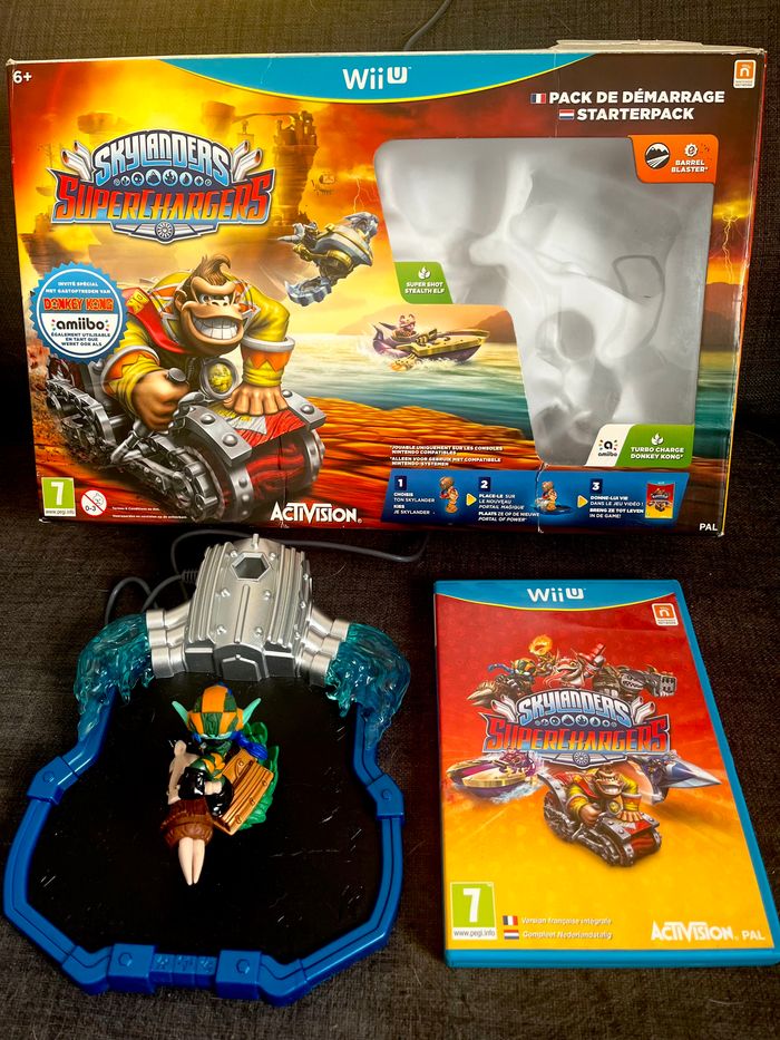 Skylanders super chargers en boite pour WIIU Jeux vendu avec sa boite et sa notice, Contient la boite, le jeux,le portail mais il n'y a qu'un seul Amiibo Le tout en bon etats, le cd et quasi neuf envoi soigne en 48h Max