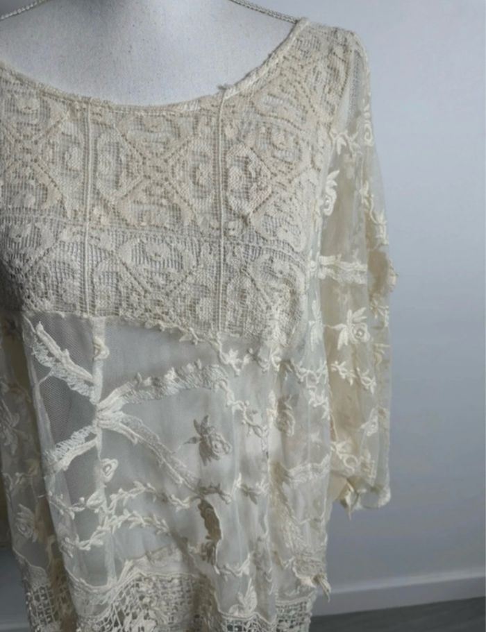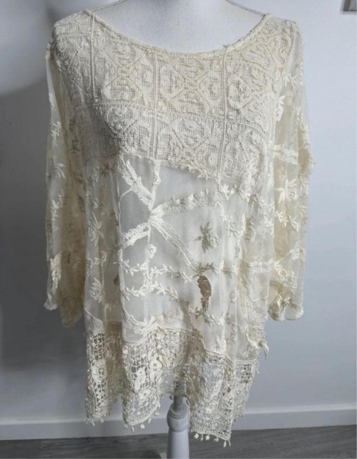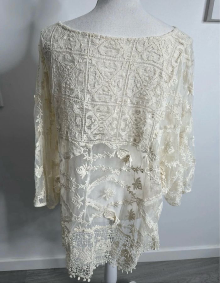 Paréo - Excellent état - Taille unique, ok du 36 au 60 Dimensions en bas de l’annonce Coupe oversize - Couleur beige crème - Broderies dentelle fleurs - Transparente au niveau des manches - Manches 3/4 - Doublure intérieure - Vintage, années 80’ - 100% Viscose - A porter en paréo, tunique ou blouse Dimensions: - 78cm niveau aisselle - 75cm de long
