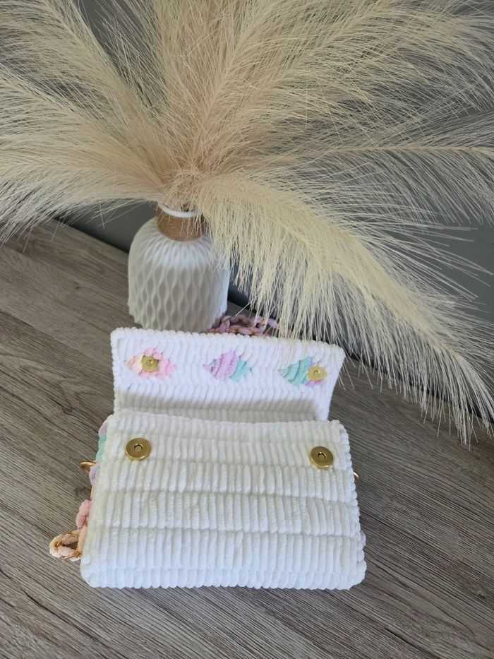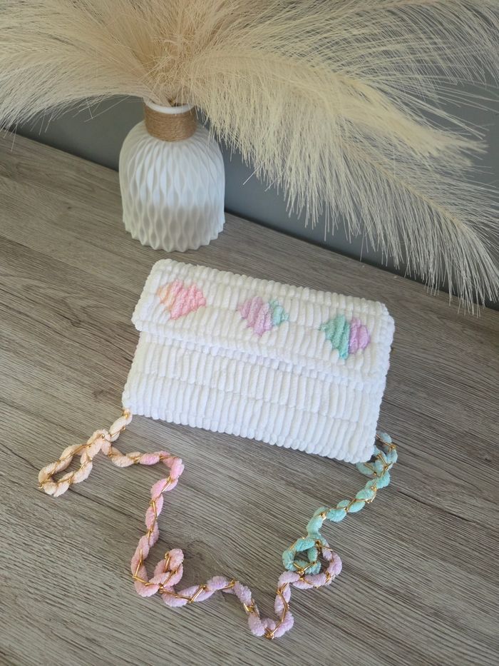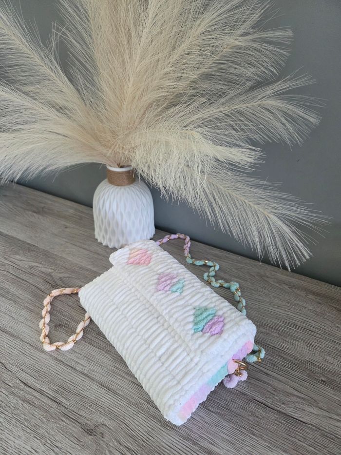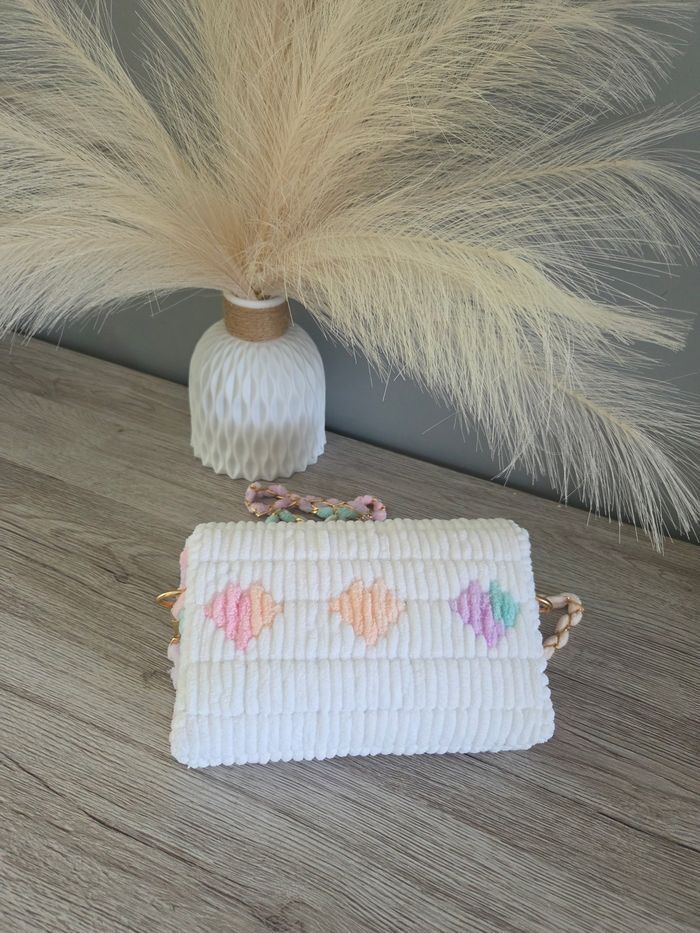 Laissez-vous charmer par l’univers tendre de Douceur Pastel. Ce petit sac blanc est orné de jolis cœurs multicolores et d’une bandoulière arc-en-ciel, pour une touche poétique et enfantine. Parfait pour les petites comme pour les grandes rêveuses, il accompagne à merveille les journées ensoleillées et les looks doux. > Dimensions approximatives : 19cm de longueur 13cm de hauteur 5cm de largeur Fait main – Pièce unique