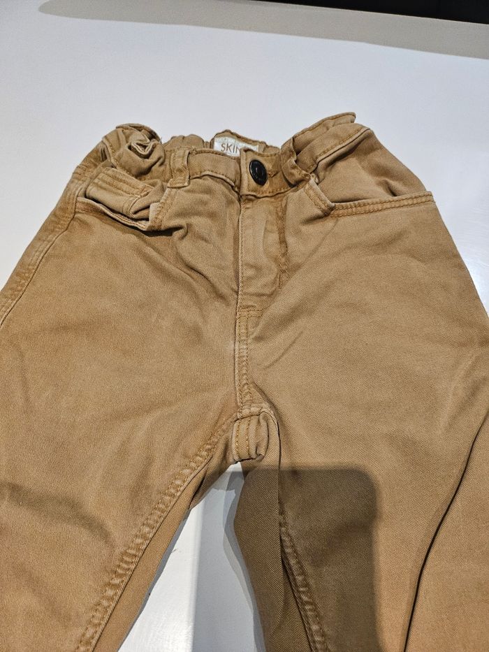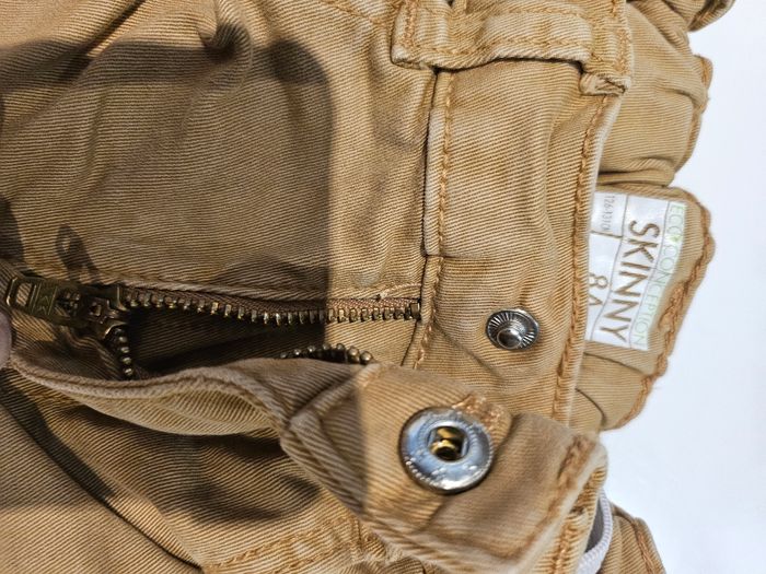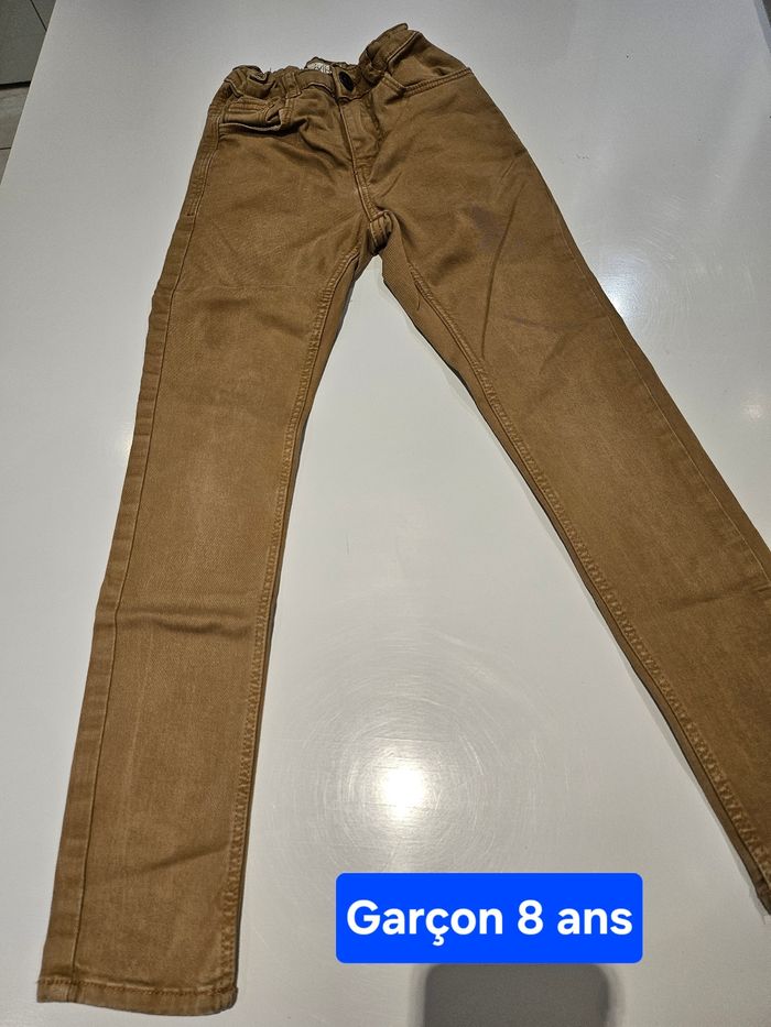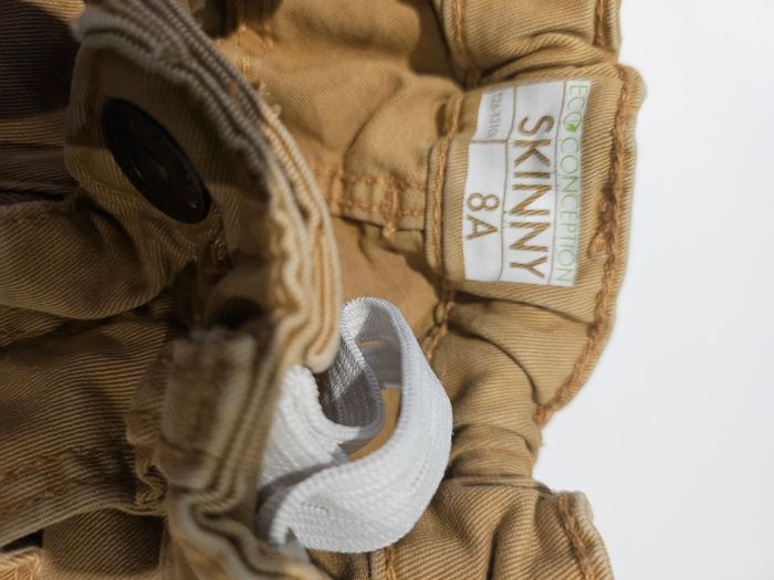 Jean skinny marron clair. Se ferme par pression et fermeture. Taille réglable. Poches devant et derrière. Marque : Kiabi Taille : 8 ans