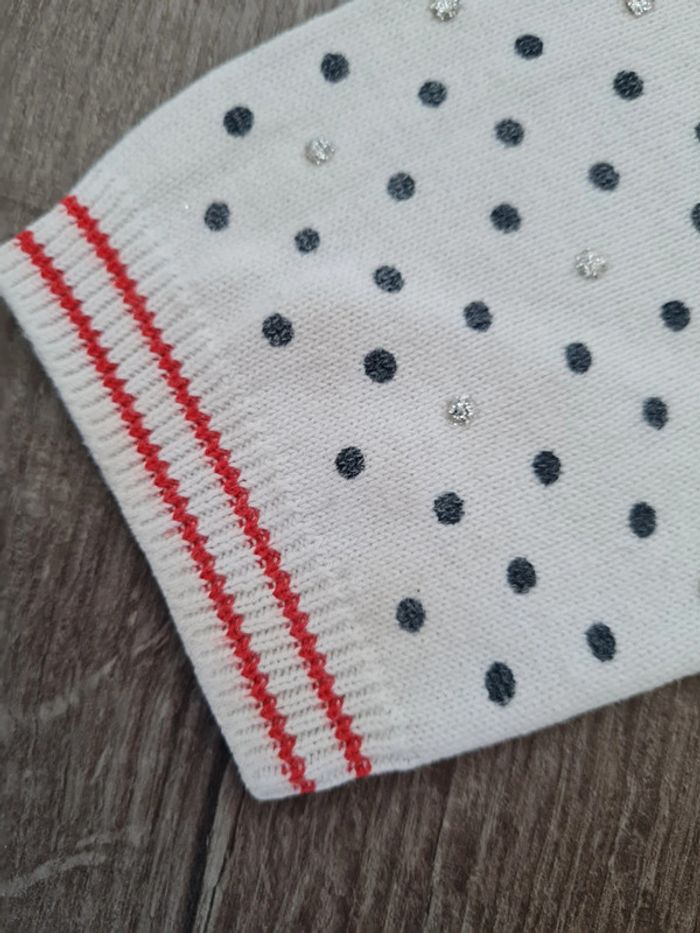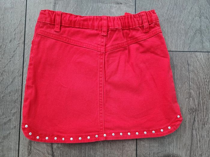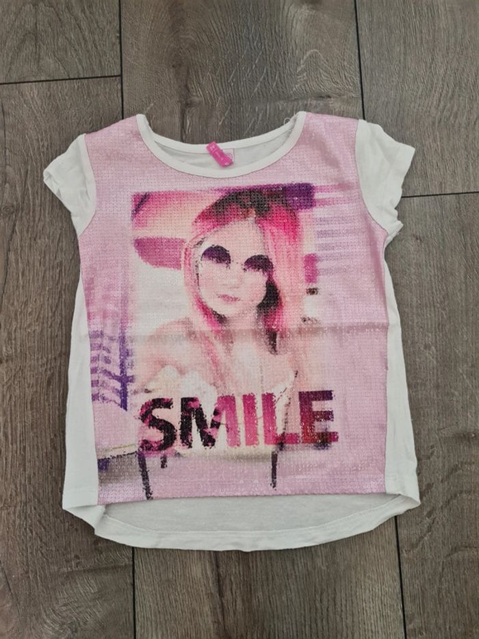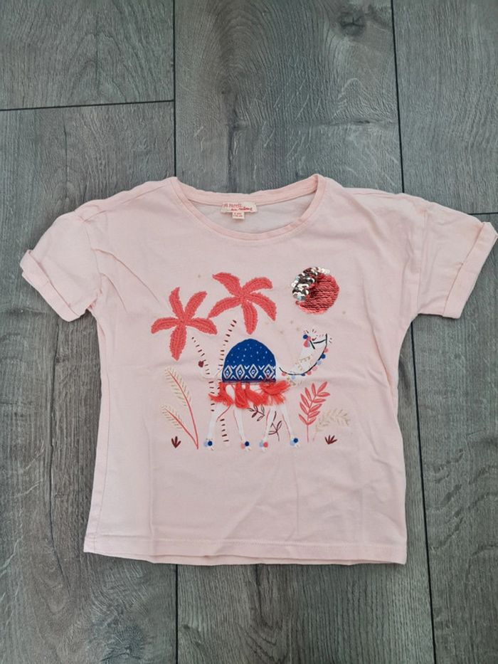 L'été approche ! Lot de 4 tee-shirts manches courtes, 1 combishort, 1 jupe et 1 gilet, en détail : Tee-shirt dromadaire Du pareil au même, avec sequins réversibles. Tee-shirt Kiabi bleu marine Sœurette Tee-shirt Okaïdi marinière rayé bleu et blanc. Summer life en sequins réversibles. Taille 6 ans, mais taille petit. Tee-shirt Gemo Smile à sequins. Combishort colorée avec motifs feuilles et fleurs. Taille élastique. Légèrement usure fesses, voir photo de près. Gilet Orchestra Disney Minnie. Pois noir et argentés brillants. Boutons cœurs.Légère tâche sur manche arrière (voir photo de près) Très jolie jupe en jean rouge, droite, achetée en supermarché. Taille ajustable. Il manque 3 strass devant et 1 derrière.