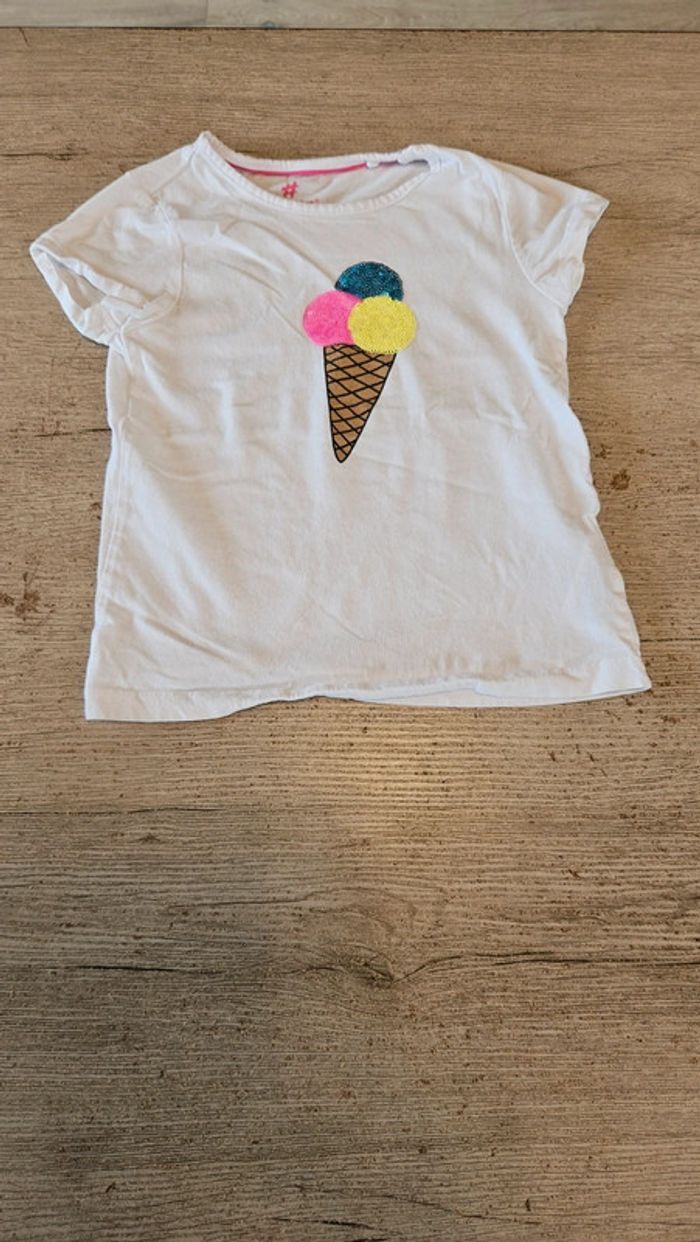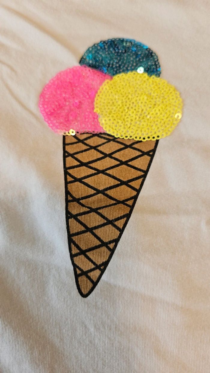 Joli t shirt d été à col rond. Manches courtes. Dessin d un cornet de glace avec les 3 boules en sequins. Peu mis. Convient mieux pour du 4 ans que du 3 ans #deborahtock_3ans #deborahtock_4ans
