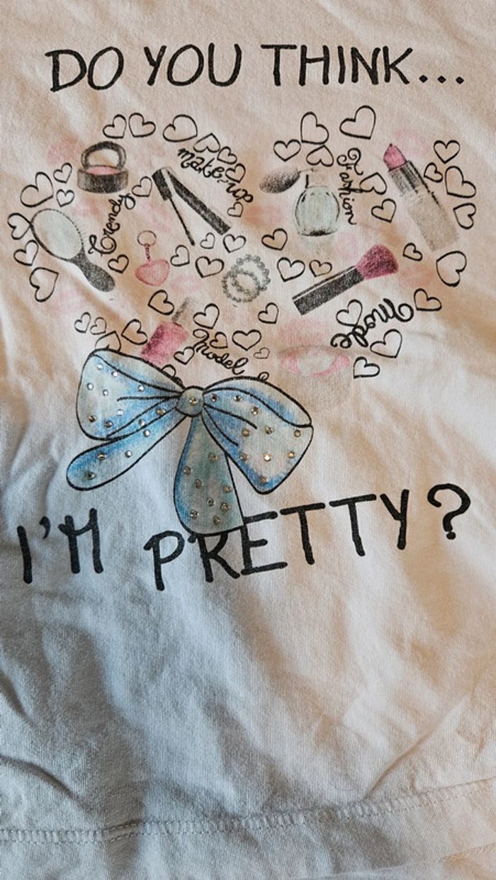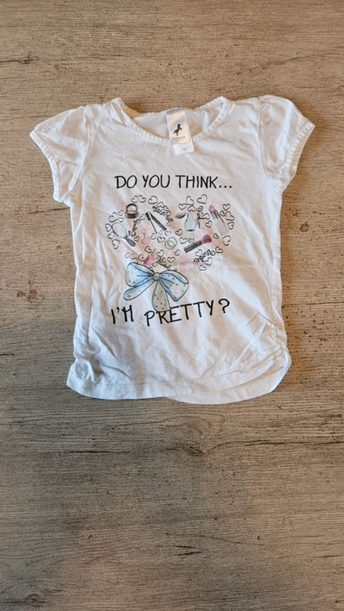 T shirt blanc à manches courtes. Peu mis. Dessins de coeurs et accessoires beauté. #deborahtock_5ans