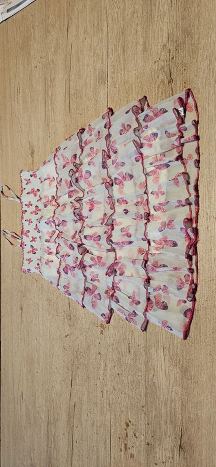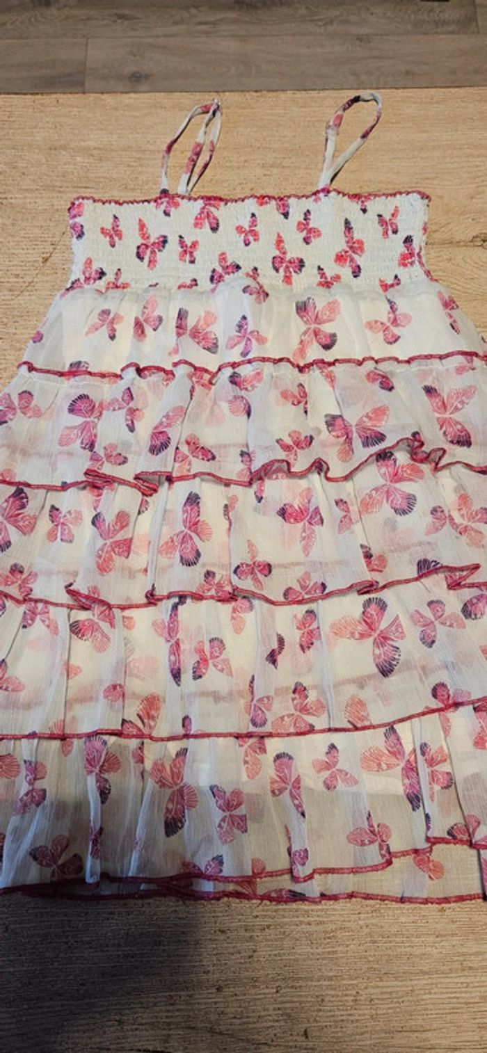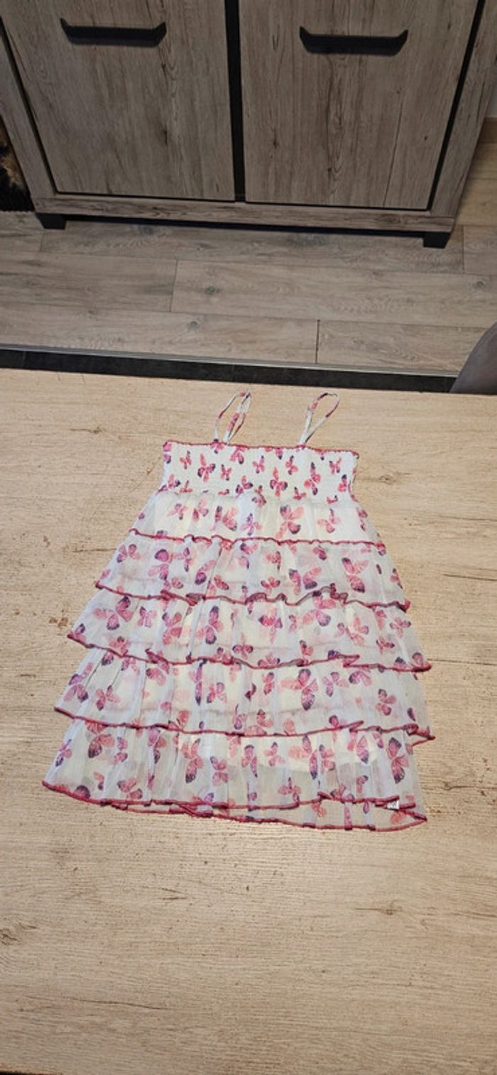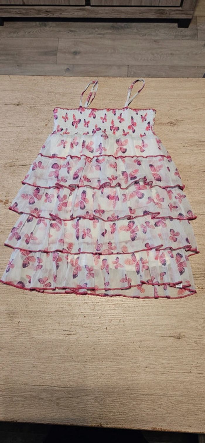 Jolie robe fluide à volants. Elastique dans le haut, niveau poitrine. Bretelles règlables. Elle a été mise mais très peu. Convient bien pour du 8 ans #deborahtock_8ans