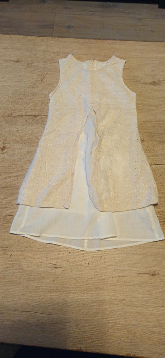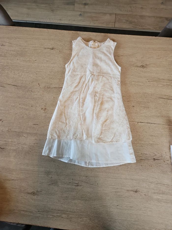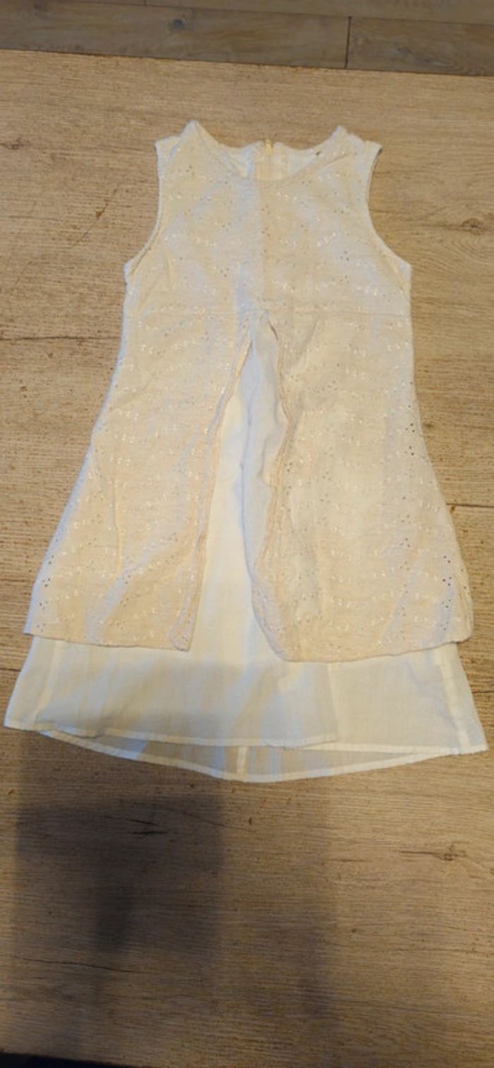 Jolie robe beige avec des broderie et une doublure blanche. Idéal pour un baptême, mariage ou autre. Elle est nickel car mise 1 ou 2 heures. Se ferme par 1 tirette à l arrière. Convient bien pour du 7 à 8 ans #deborahtock_8ans