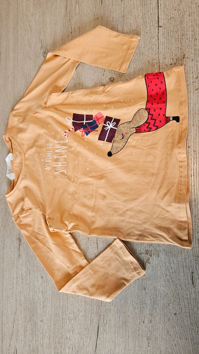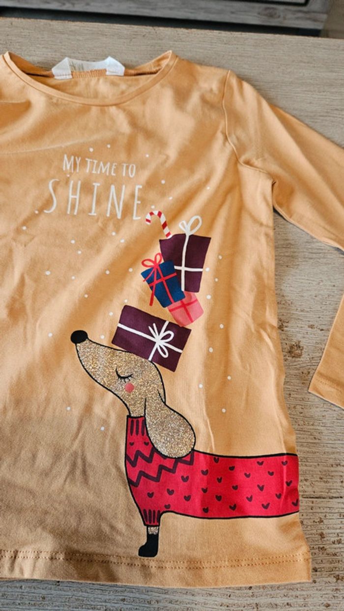 Joli t shirt orange très clair avec un dessin de chien avec des cadeaux. Il n a jamais été mis mais sans étiquette car lavé. Elastique. Convient bien pour du 5 à 6 ans. #deborahtock_4ans #deborahtock_5ans #deborahtock_6ans