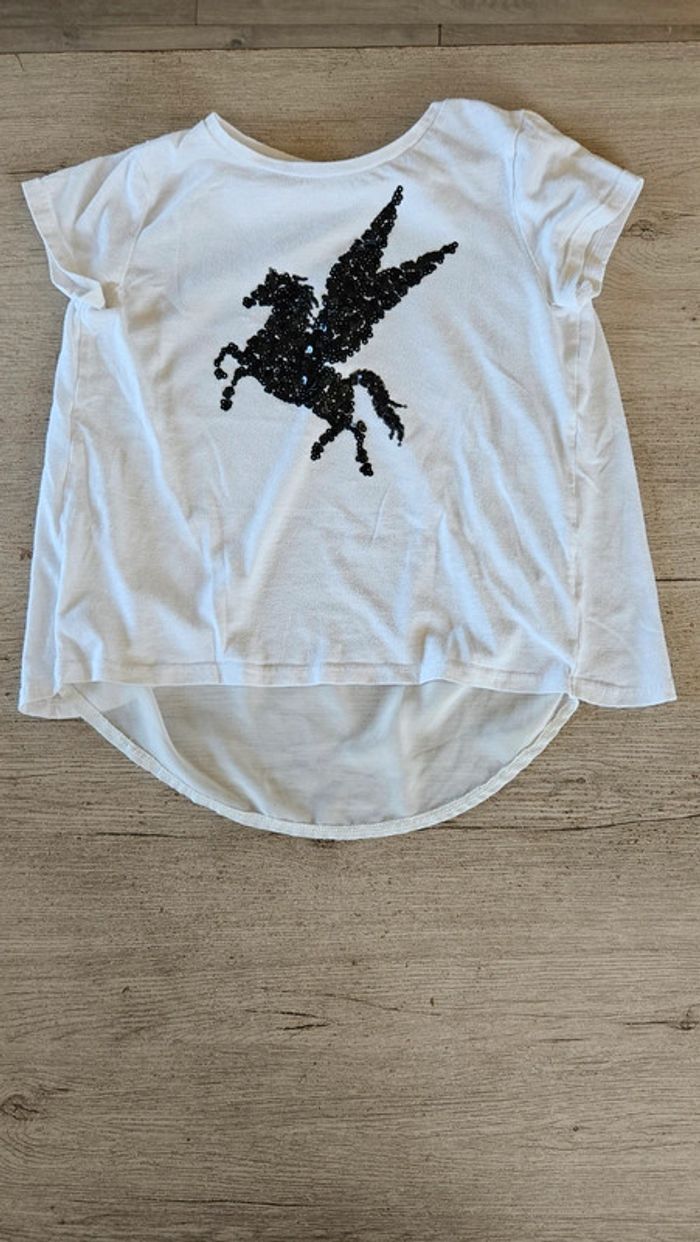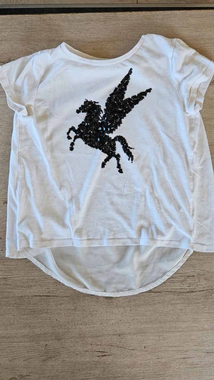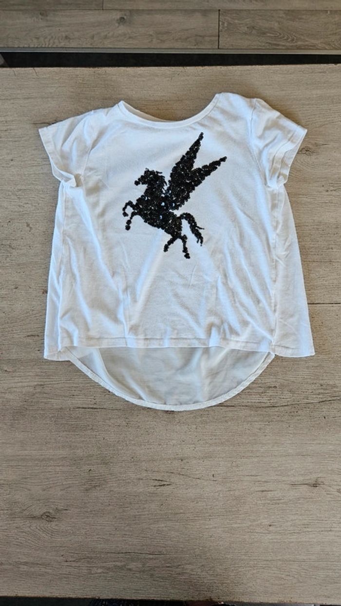 Blouse bmanche à manches courtes, avec licorne en sequin noir, taille 10/12 ans - photo numéro 1