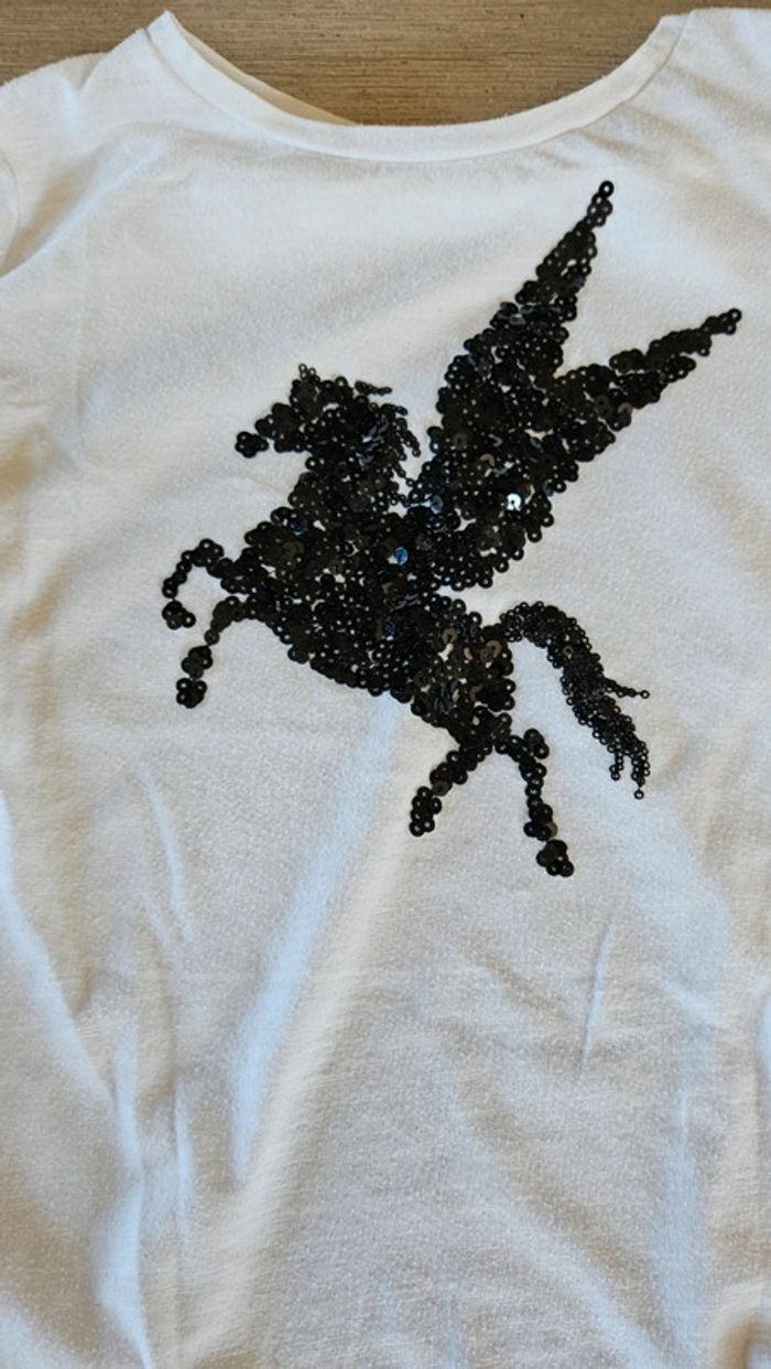 Blouse bmanche à manches courtes, avec licorne en sequin noir, taille 10/12 ans - photo numéro 2