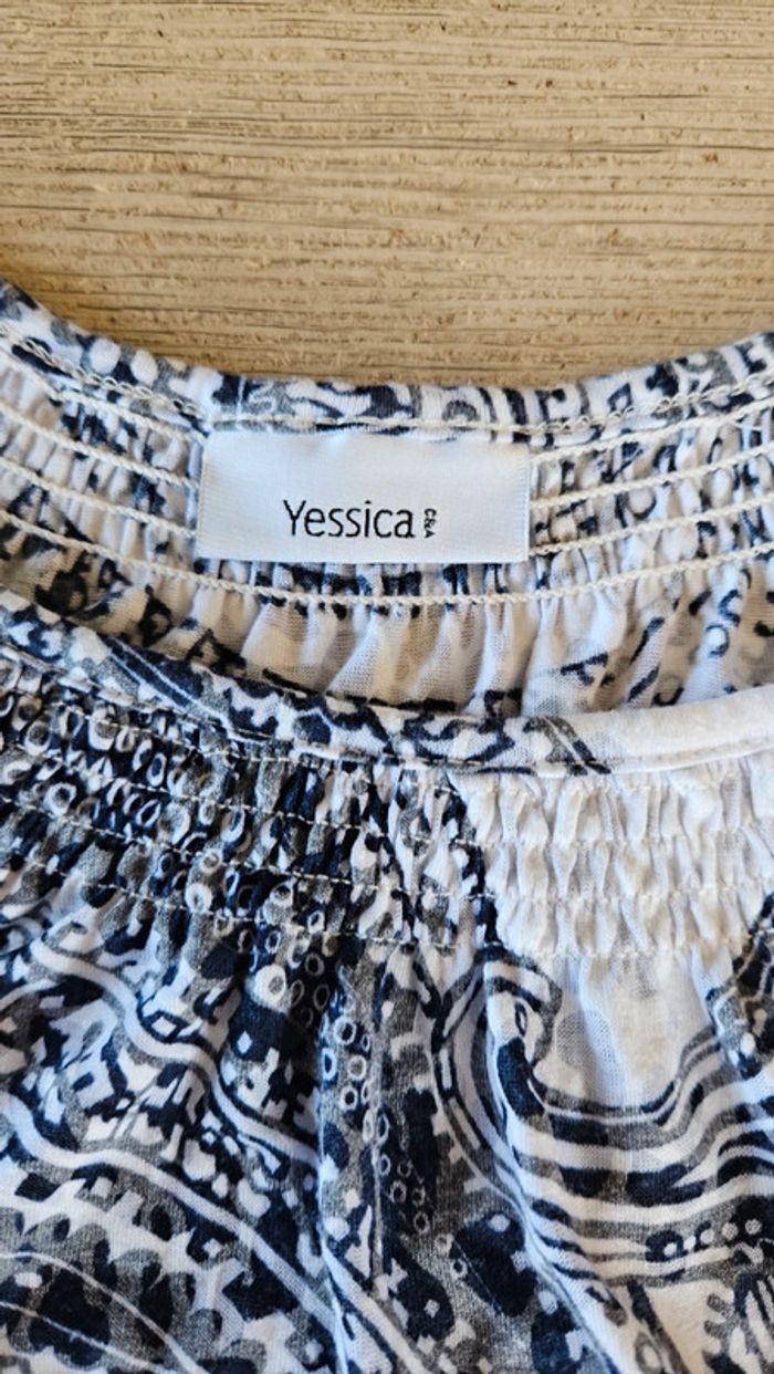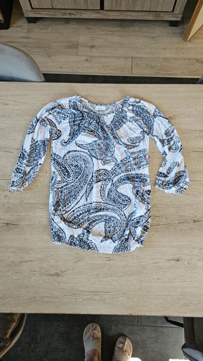 Blouse larhe à manches 3/4, blanche à dessin, Yessica, taille S, nickel