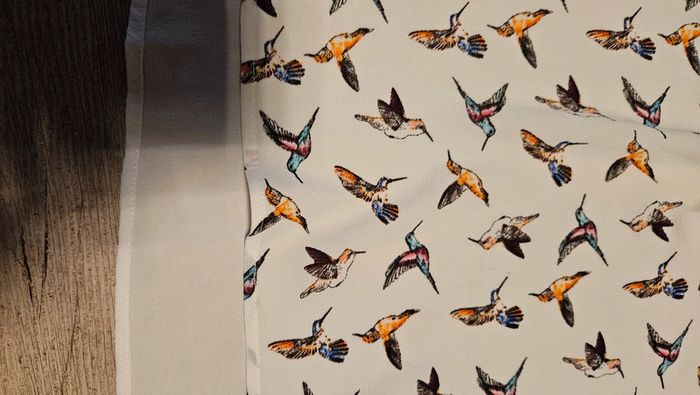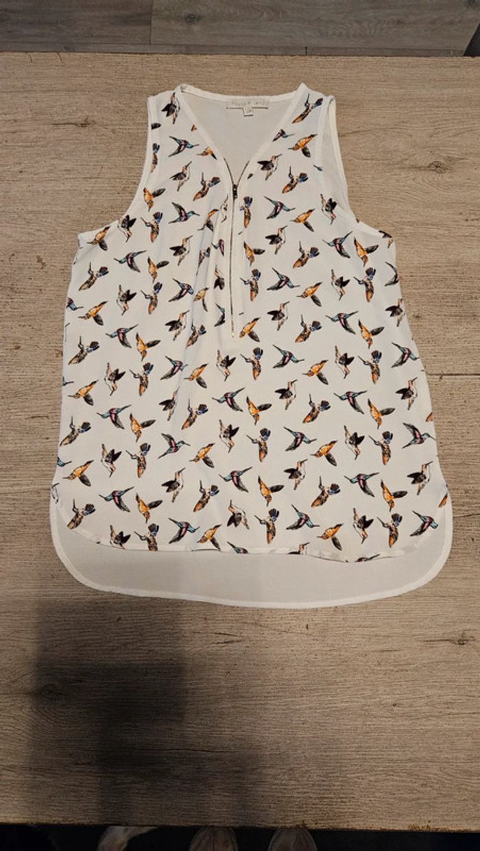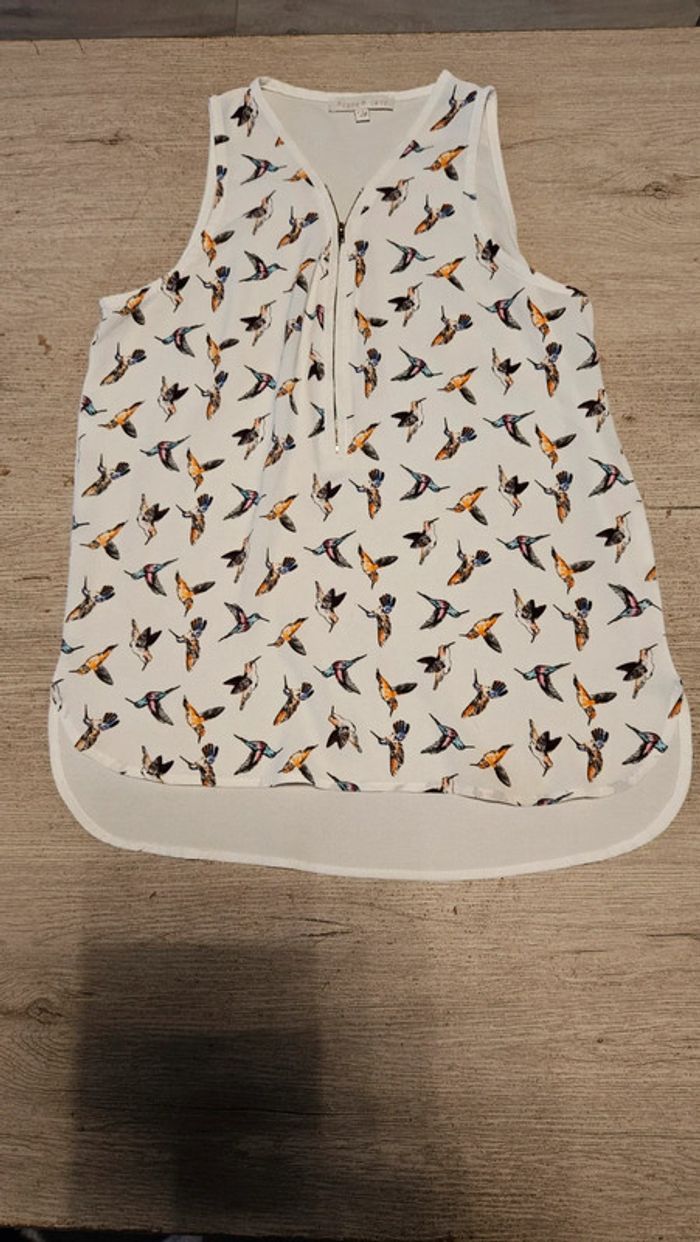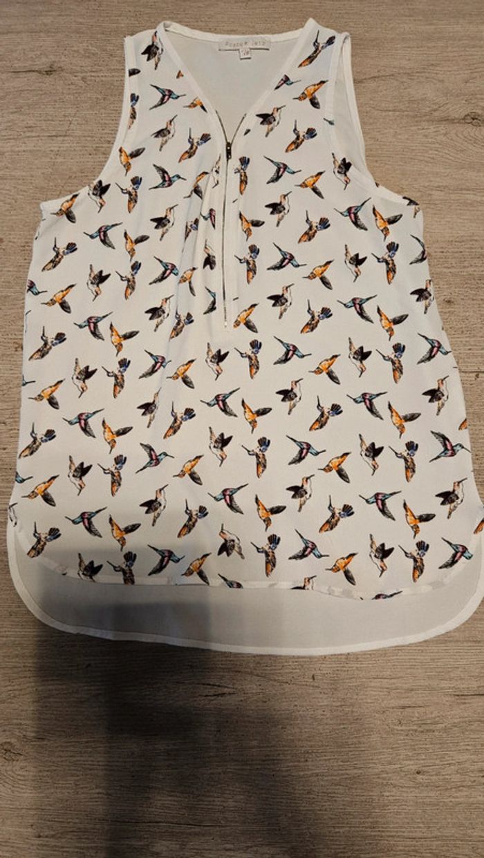 Jolie chemise sans manche beige avec des oiseaux. En excellent état car peu mise. Col en v avec une tirette. Matière fluide et légère. Convient bien pour du S à M #deborahtock_femmeS #deborahtock_femmeM
