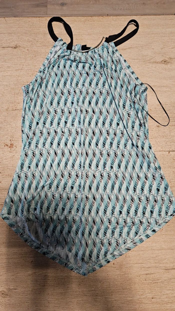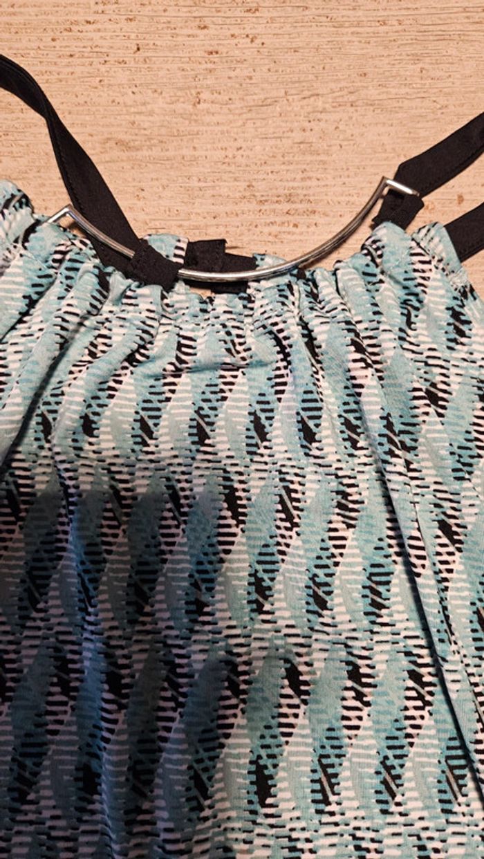 Joli débardeur femme qui se termine en pointe devant. Le col et les bretelles sont reliés par un arc en metal. Neuf avec étiquette. Convient bien pour du S #deborahtock_femmeS