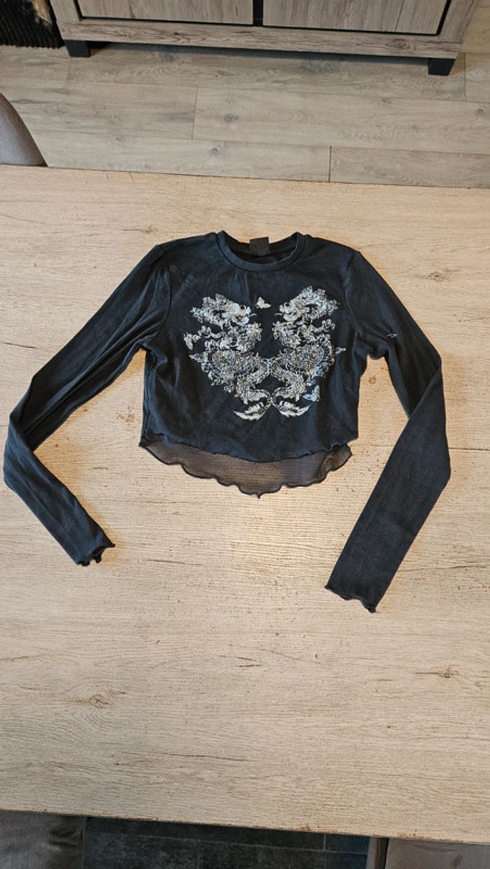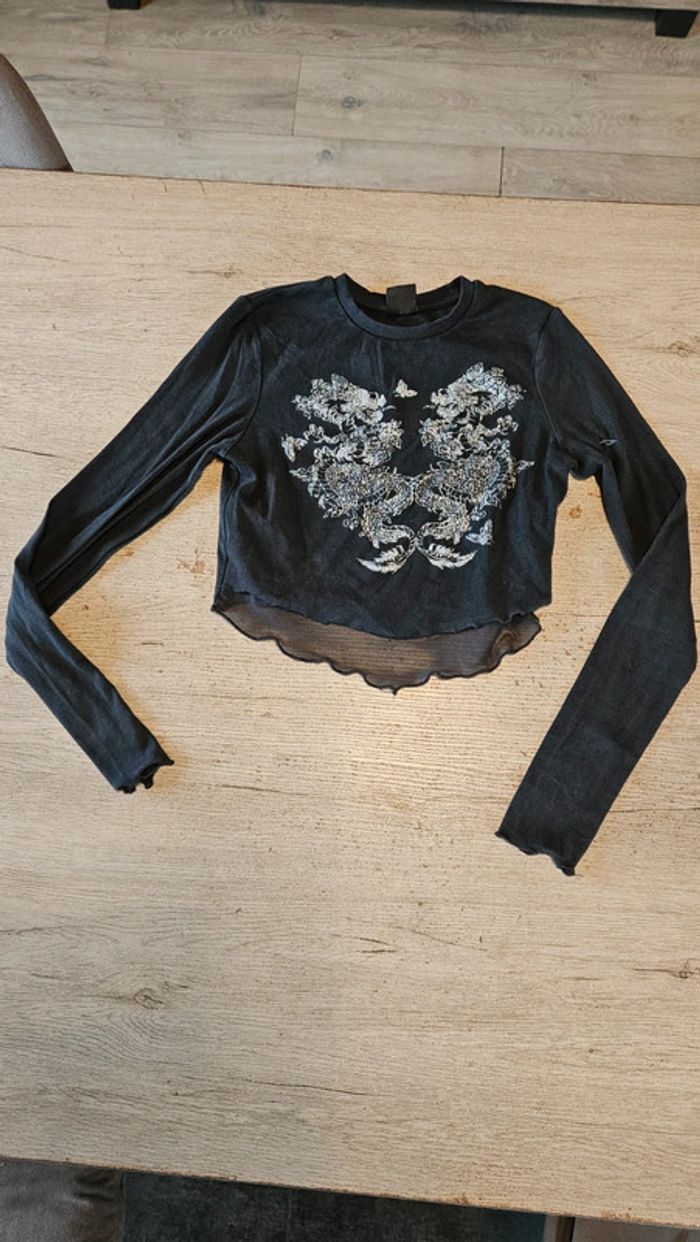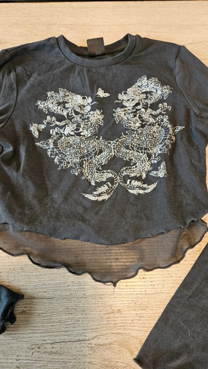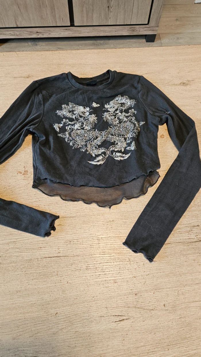 Croc top gris foncé, avec voile, manches longues, dragons brillants, Bershka, taille M - photo numéro 2