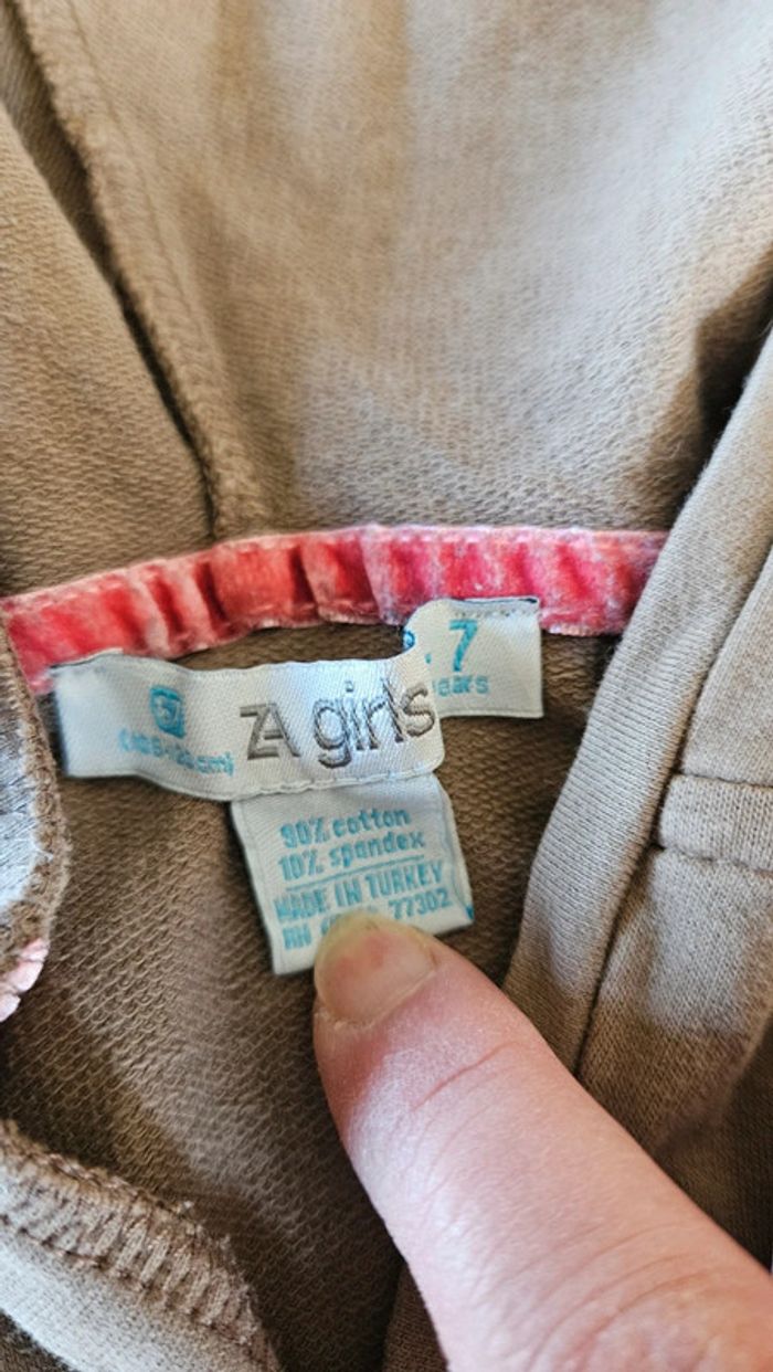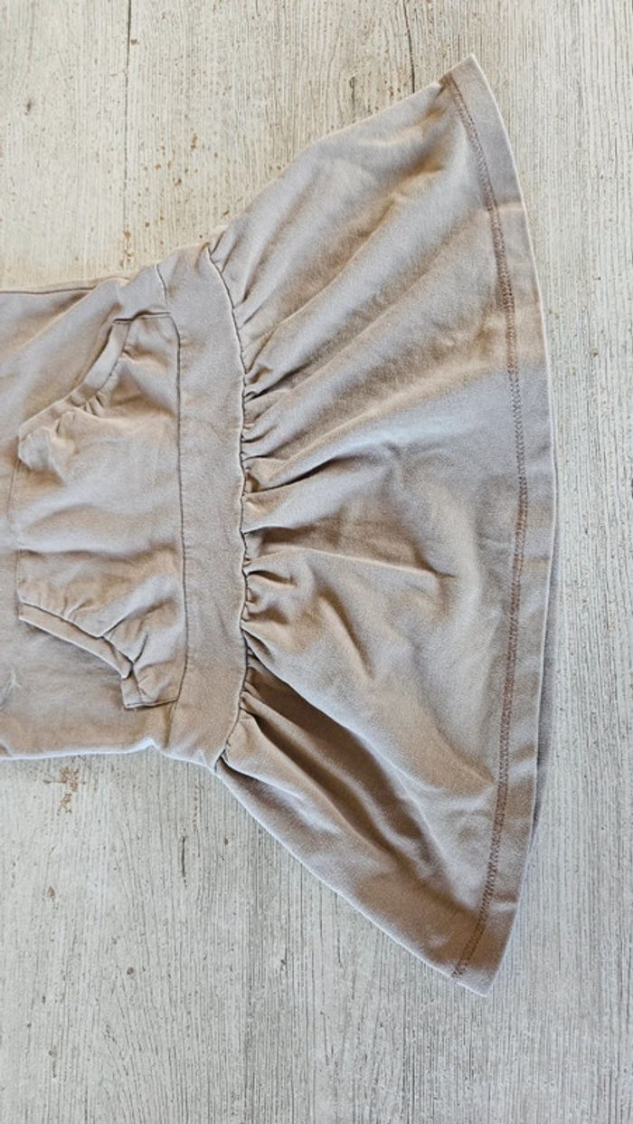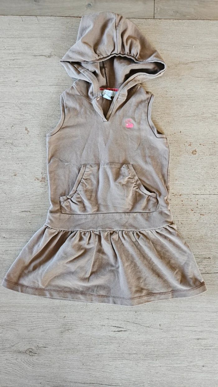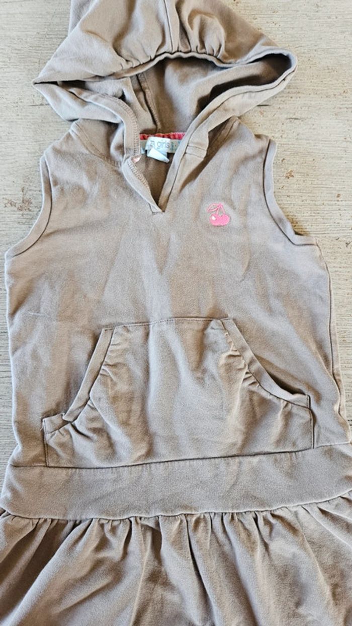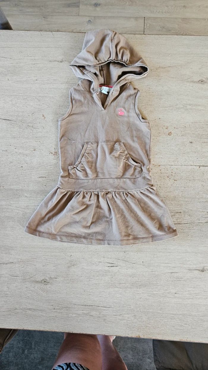 Robe brun clair ou beige très foncé. Sans manche avec une capuche. En très bon état, mise que 2 ou 3 fois. Poche centrale. Ceintrée. Convient bien pour du 6 à 7 ans #deborahtock_6ans #deborahtock_7ans