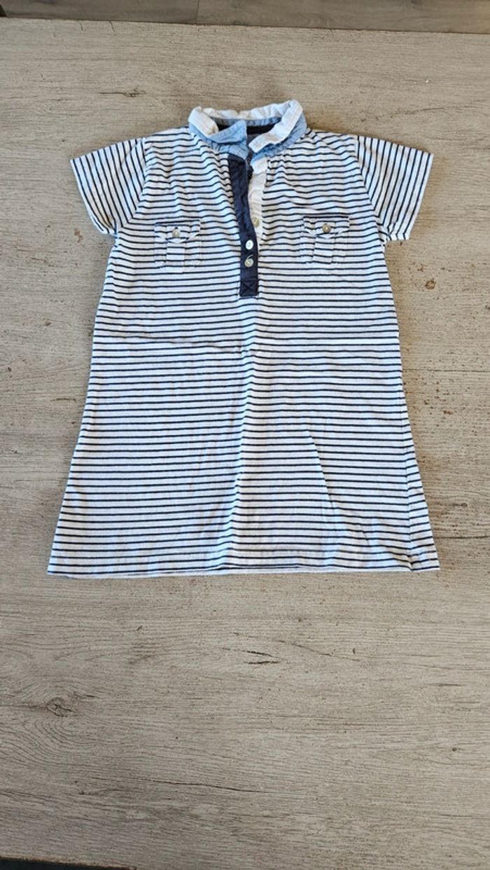Jolie robe classique Buissonnière. Elle est blanche ligné bleu foncé. Col qui se ferme avec des boutons. Micro poche. Lien pour mettre un cordon à la taille (non fourni). Mise 2 fois. Convient bien pour du 5 à 6 ans #deborahtock_6ans