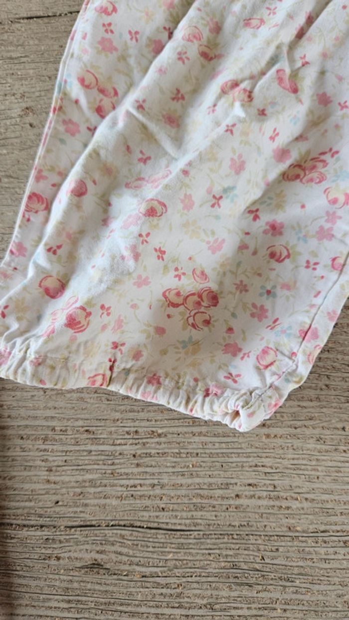Pantalon d été très léger. Il est blanc cassé/beige avec des fleurs rose, rose clair. Élastique à la taille. Lien dans le bas pour faire 1 noeud. Convient bien pour du 18 mois #deborahtock_18mois