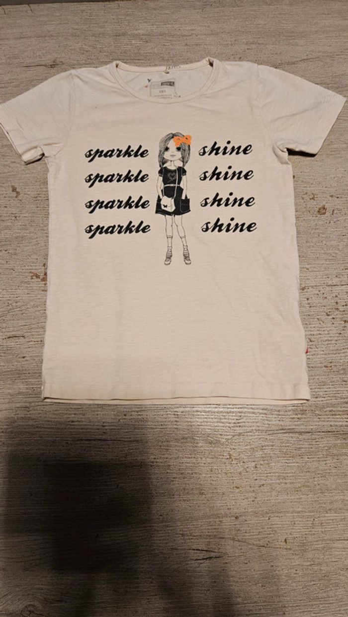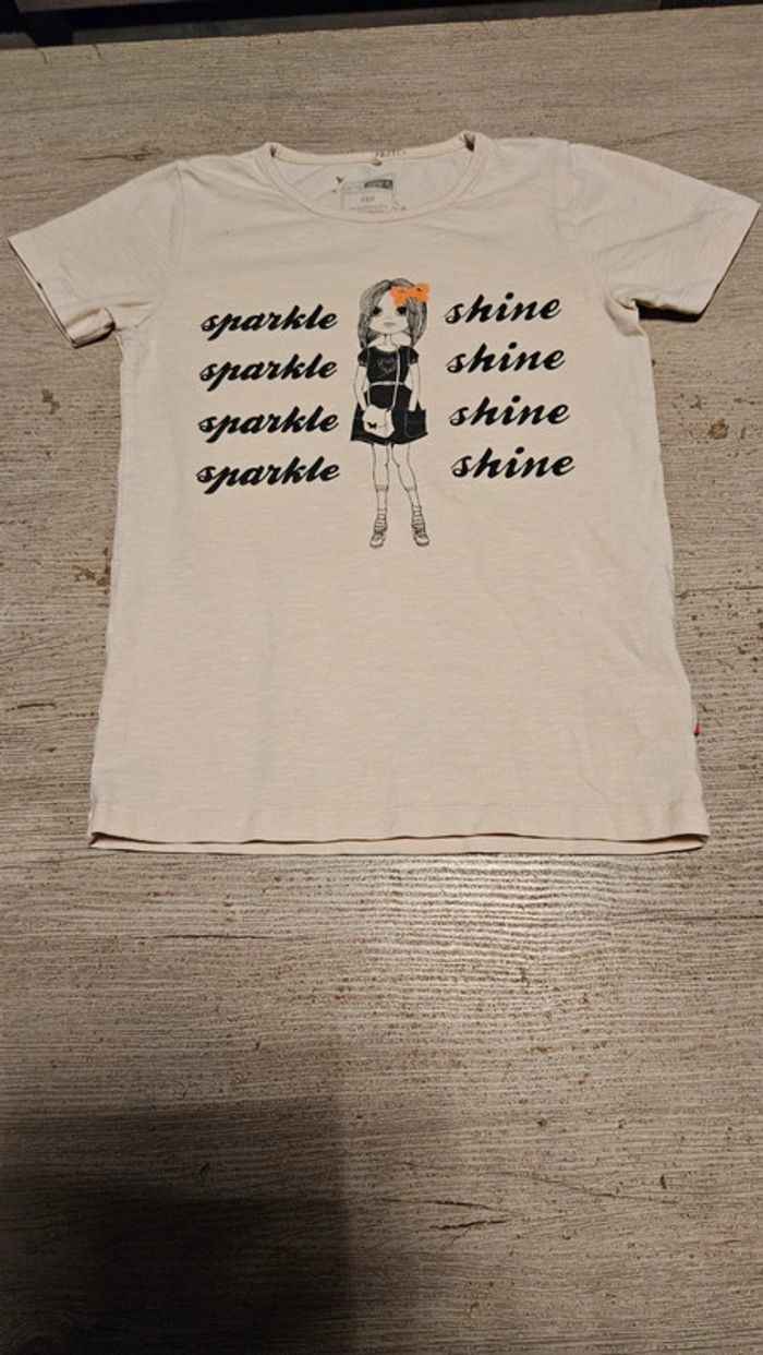 T shirt pour fille de couleur beige rosé. Très peu mis. Col rond. Inscriptions et dessins noirs. Convient bien pour du 11 à 12 ans #deborahtock_11ans #deborahtock_12ans