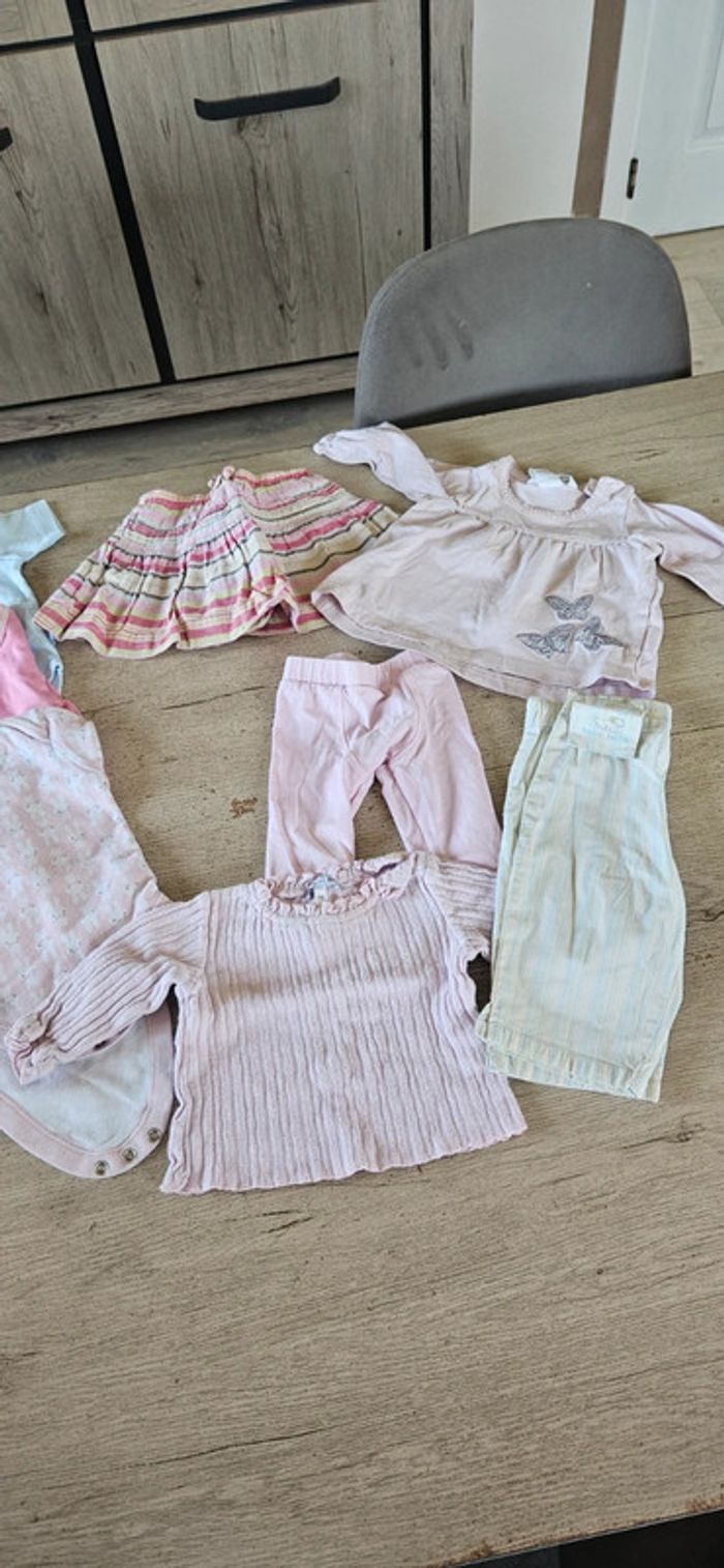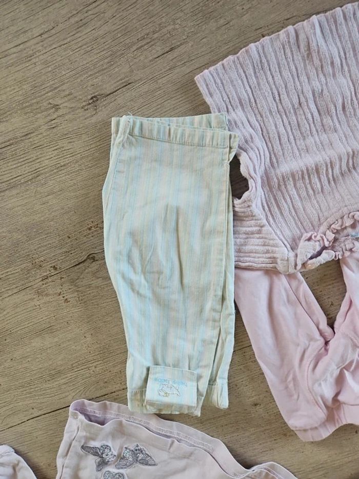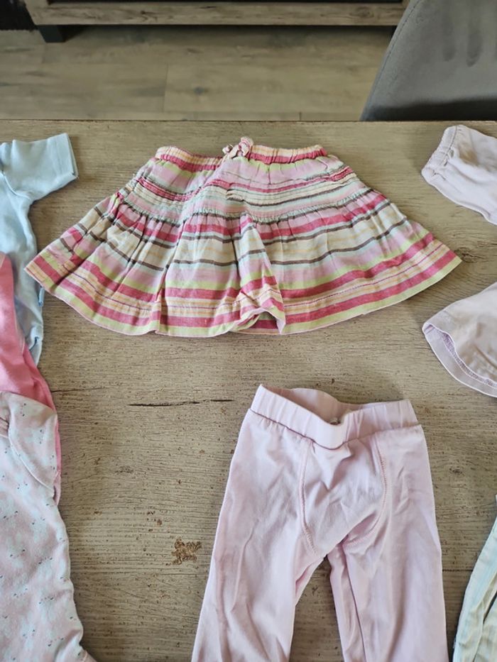 10 vêtements 1 chemise blanche en lin, jamais mise 1 legging rose avec petites fleurs 3 bodies 1 legging rose uni, nickel 1 jupe ligné, Gap, mise 1 fois 1 blouse rose clair 1 pantalon ligné pastel 1 blouse papillon #deborahtock_3mois #deborahtock_lot