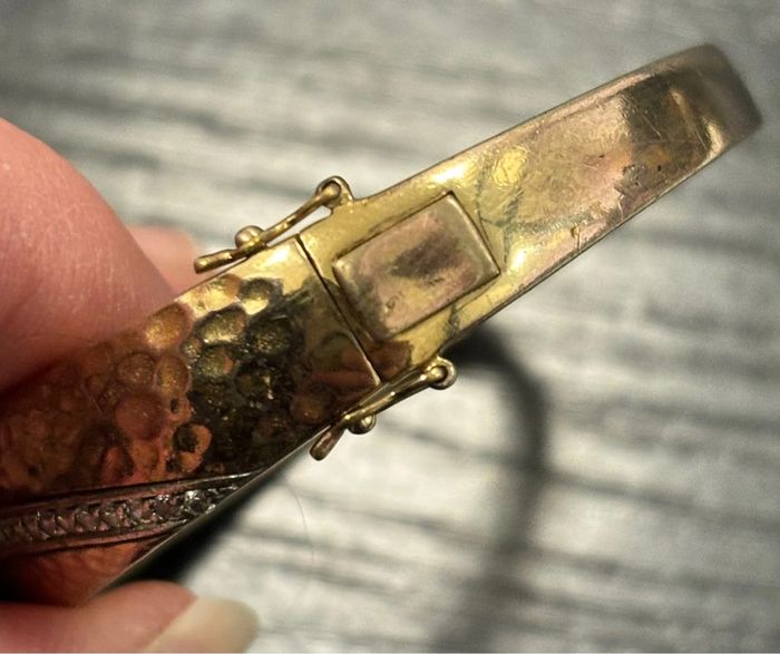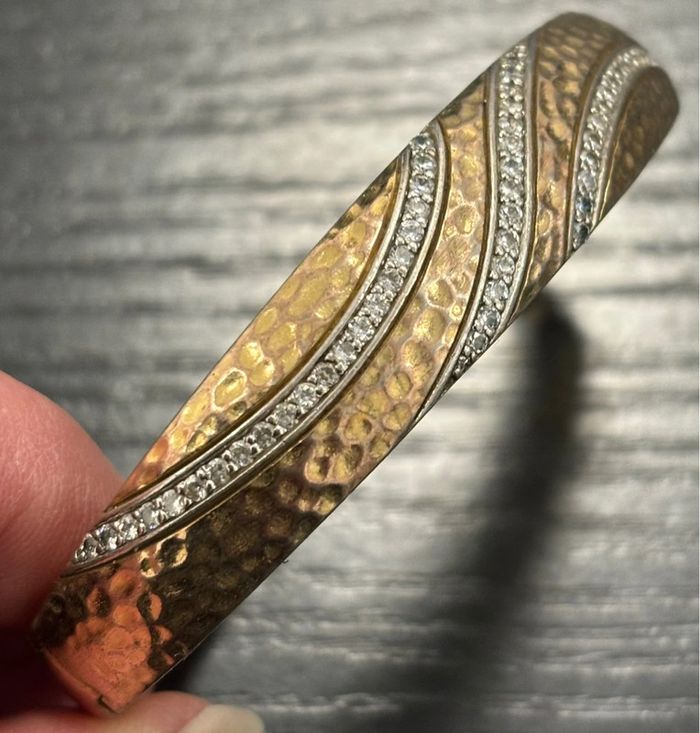 Beau bracelet «jonc » semi-rigide en plaqué or martelé parsemé de petits brillants, pour femme, en très bon état. Diamètre: 6,3 mm, largeur: 1,3 cm au plus large, poids: 30,6 grammes. #merine103 #merine103bijoux
