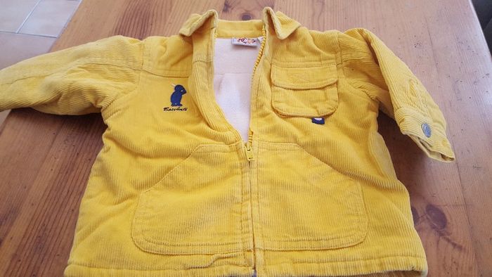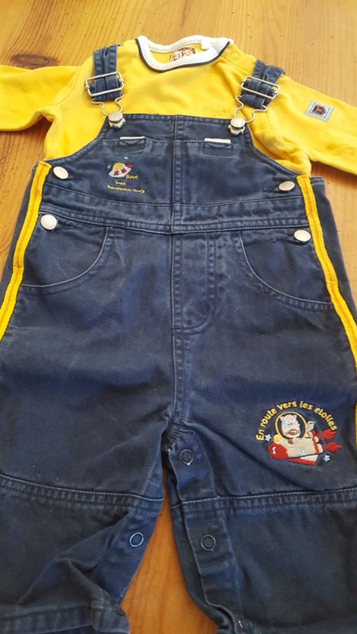 Salopette en jean bleu marine Tee shirt jaune Blouson en velours fin Marque tout compte fait Taille 6 mois