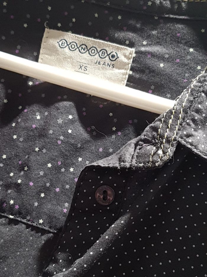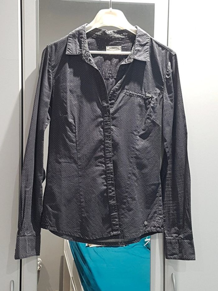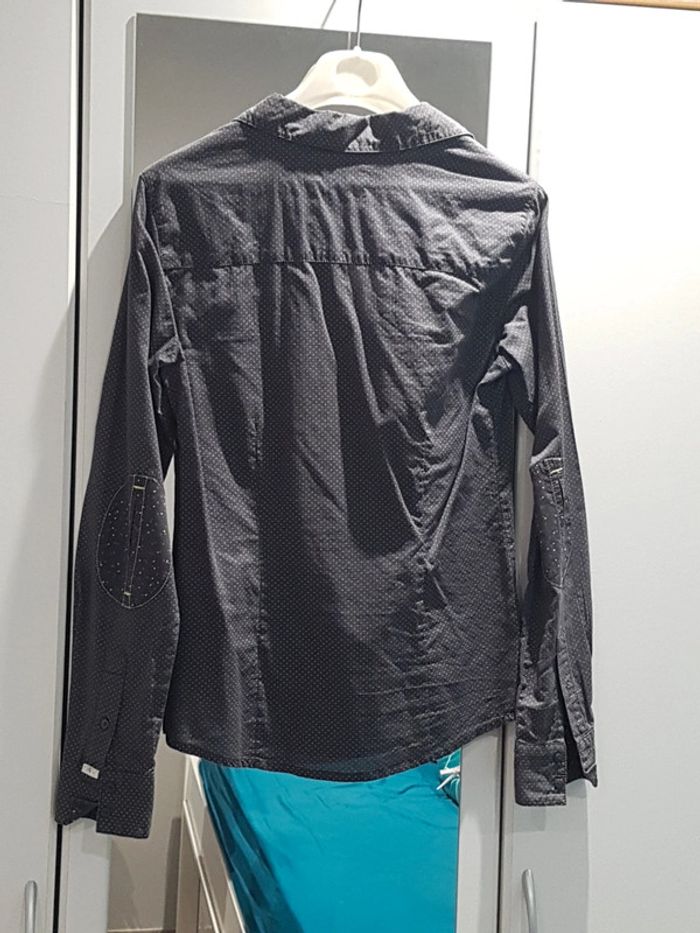 Chemise grise à pois blanc Bonobo taille XS. Motifs sur les coudes, cintree a la taille.