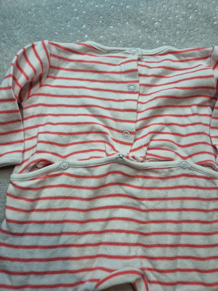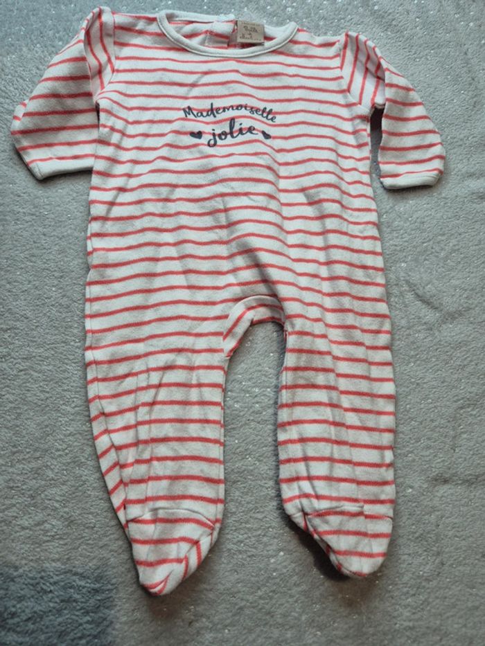 Pyjama mi-saison 3 mois Mademoiselle jolie En très bon état presente juste de très légères bouloches et à l'arrière teinture légèrement partie sur l'une des pressions #3moisfilleduroc
