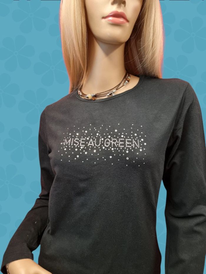 Mise Au Green T-shirt noir Manches longues Motif strass devant Comme neuf Longueur : 60 cm Aisselle à aisselle : 45 cm #miseaugreen #tshirtnoir PB.4