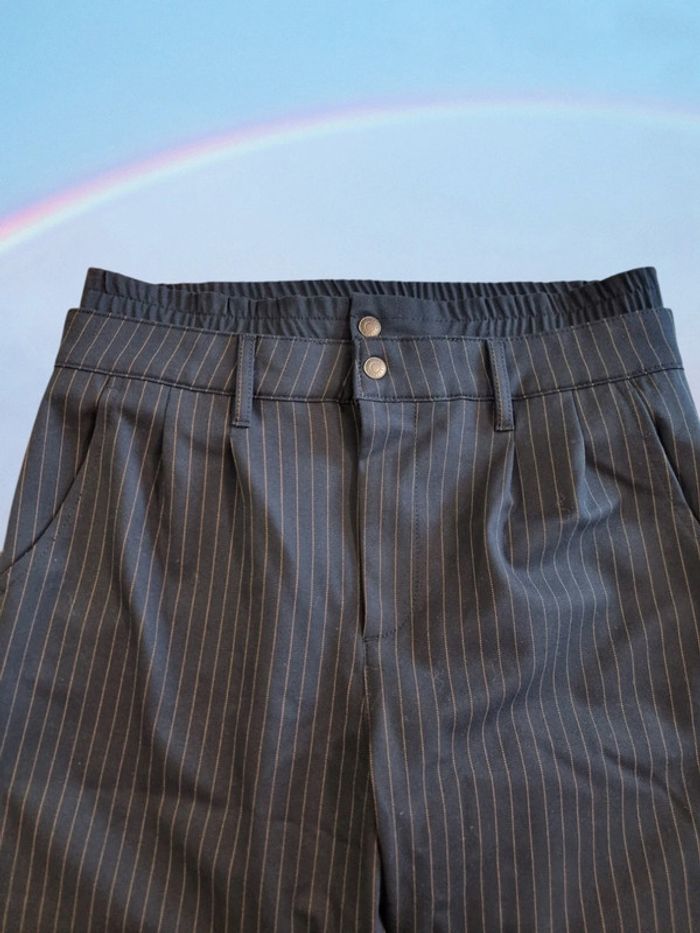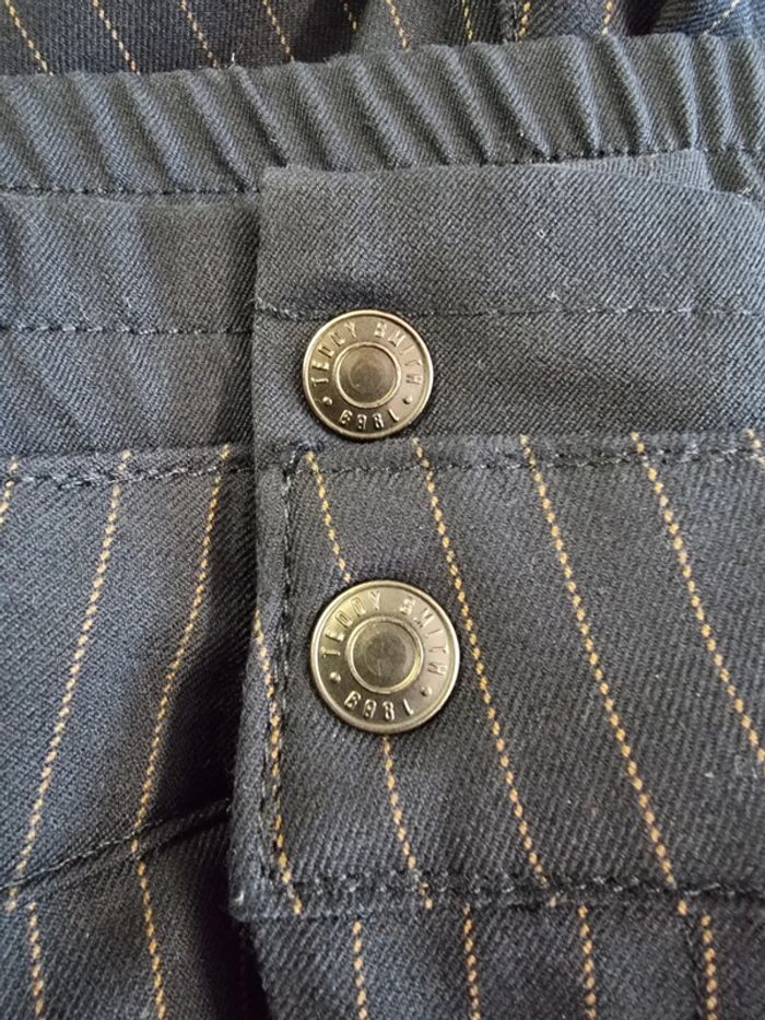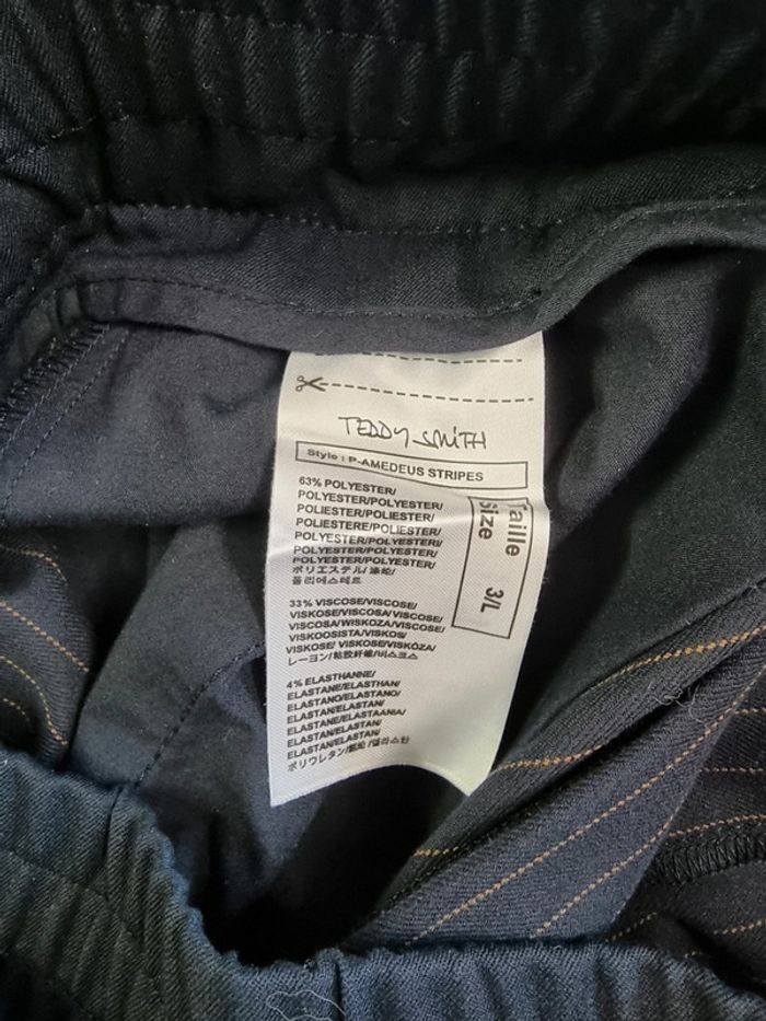 Teddy Smith Pantalon court chino Taille 3 (L) Comme neuf Bleu marine rayures Effet double ceinture Fermeture éclair+ 2 boutons pression Longueur : 92 cm Entrejambes : 60 cm Taille à plat : 42 cm Largeur cuisses à plat : 30 cm #teddysmith #pantalonchinofemme PB.6