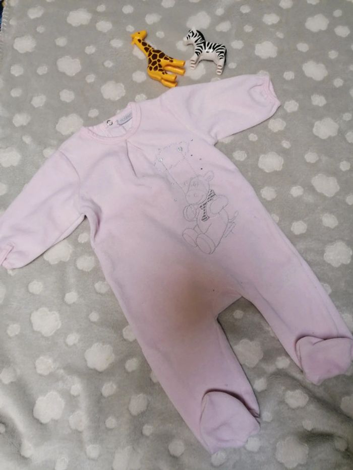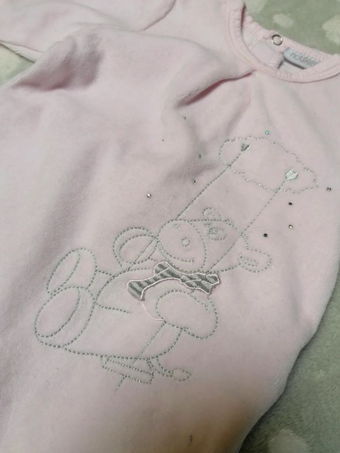 Grenouillère rose pale de chez Noukies. Motif brodé au fil argenté. Taille 6 mois, 68cm