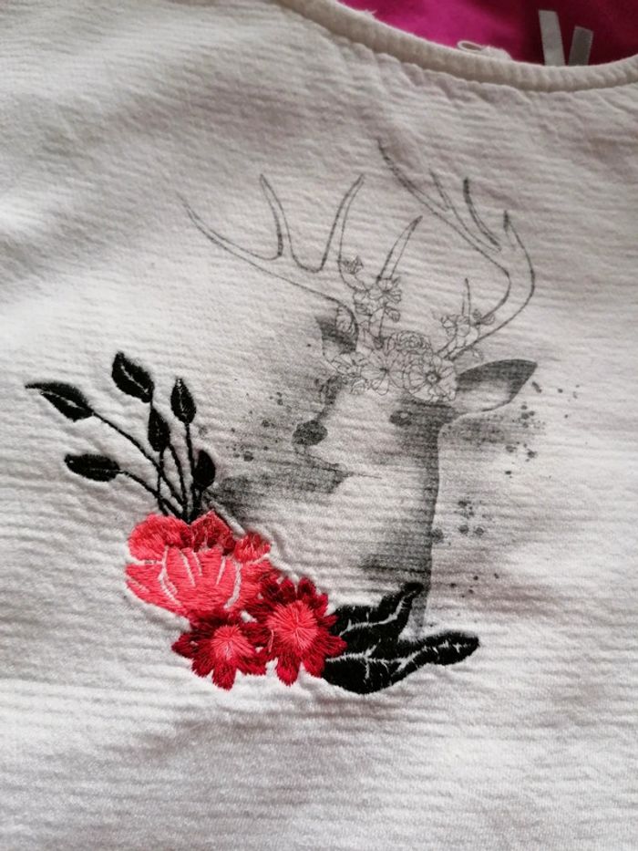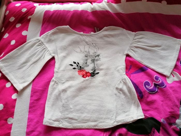 Haut blanc avec broderies et biche imprimée. Manches 3/4 évasées. Taille 3 ans 98cm