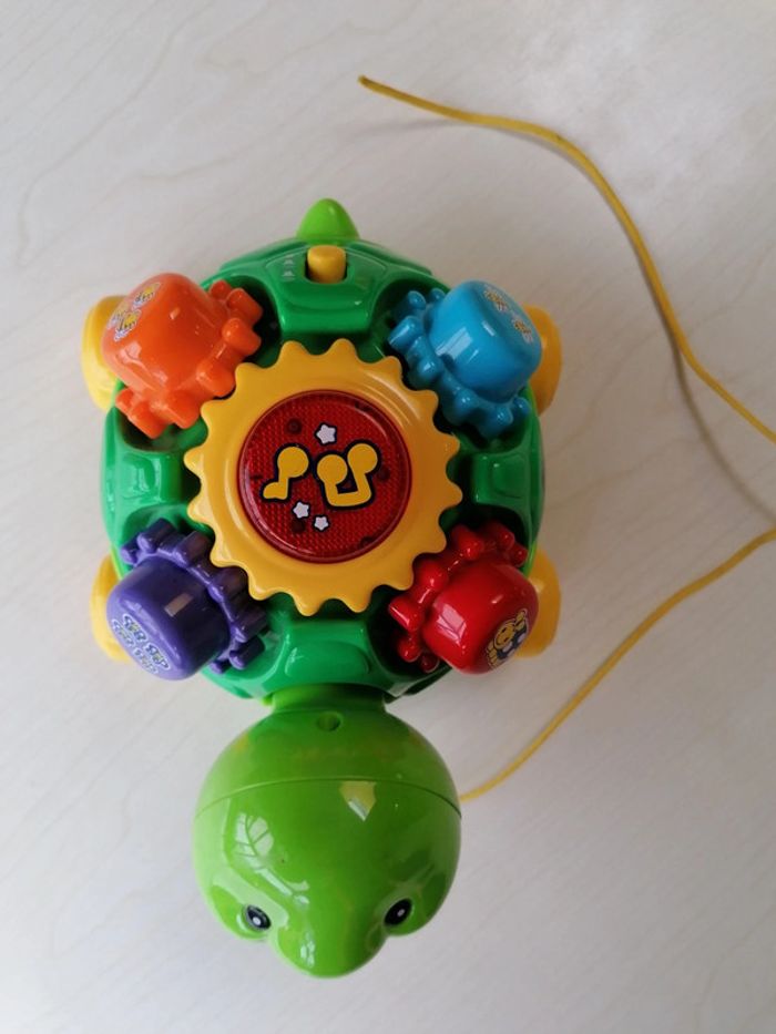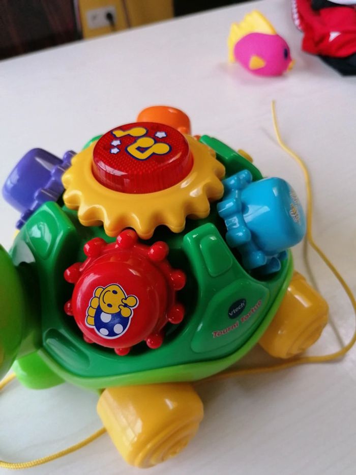 Tourni tortue de Vtech Une tortue rigolote qui bouge son cou quand on la promène. Sur sa carapace un système d’engrenages à manipuler pour découvrir les couleurs, les insectes et les premiers chiffres. 10 mélodies et 2 chansons Age : 9 - 36 mois Fourni avec les piles