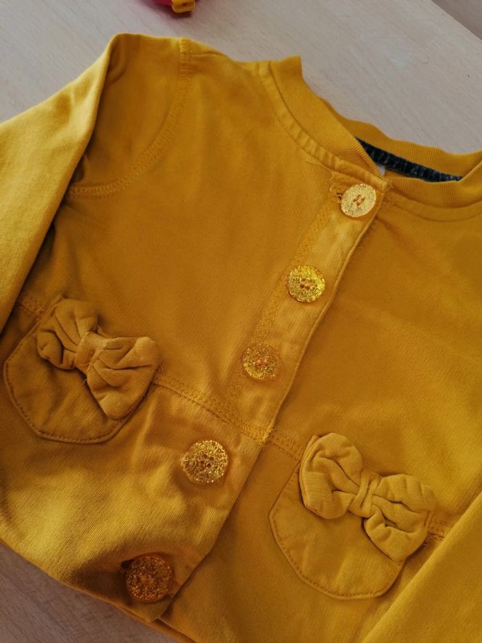 Gilet jaune moutarde avec nœuds sur les poches. Taille 92cm