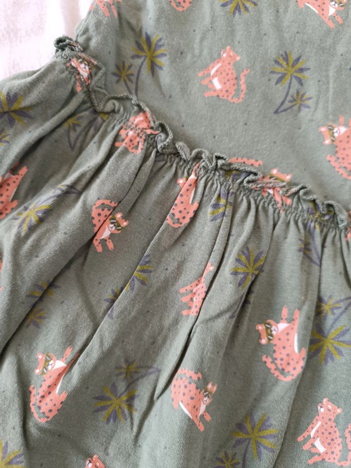 Robe d'été kaki avec motifs de léopard de chez Kiabi. Taille élastique avec fantaisie. Taille 5 ans, 110 cm