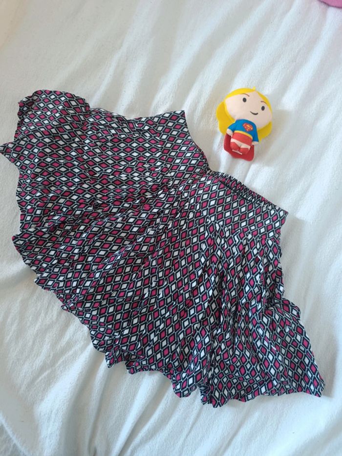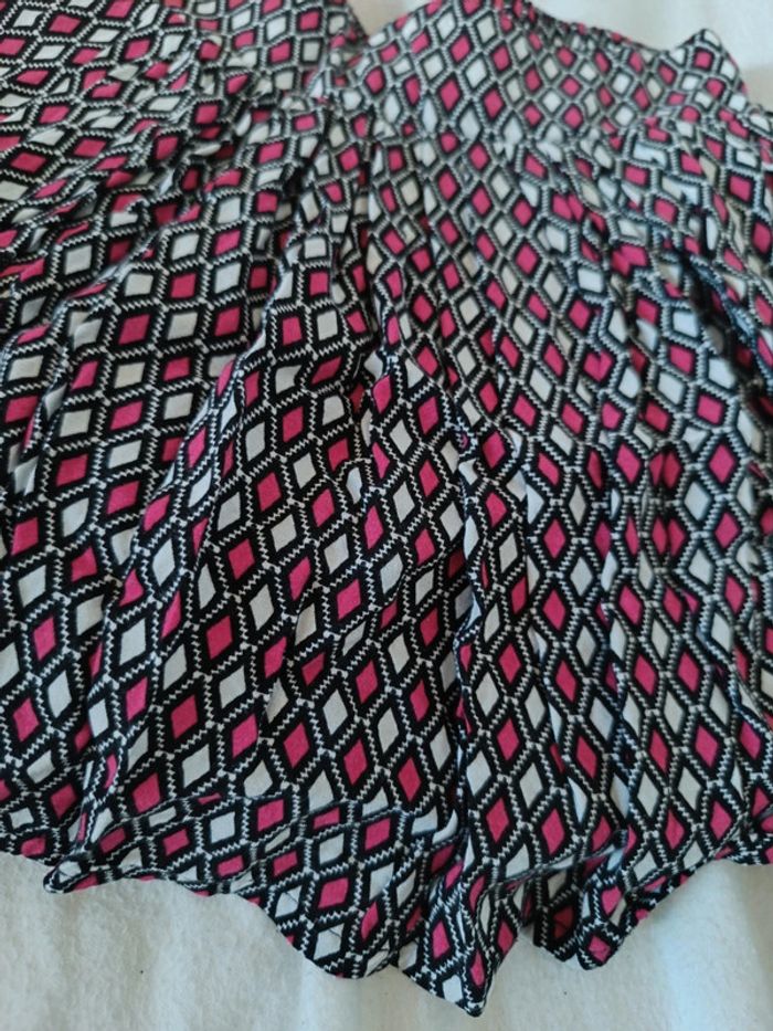 Jupe à motifs de losange blanc et rose fushia. Taille élastique dans le dos. Doublée. Taille 5 ans. Maison sans animaux et non fumeur.