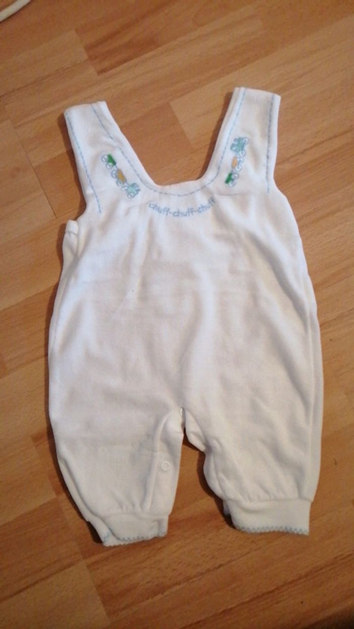 Ensemble 2 pièces. T-shirt longues manches + salopette dans les tons blancs. Motifs de train brodés au niveau de l'encolure. Consultez mes autres articles en 6 mois #aurelieetfred6mois