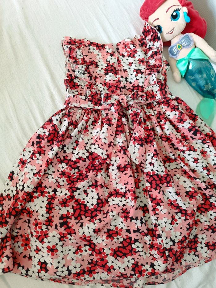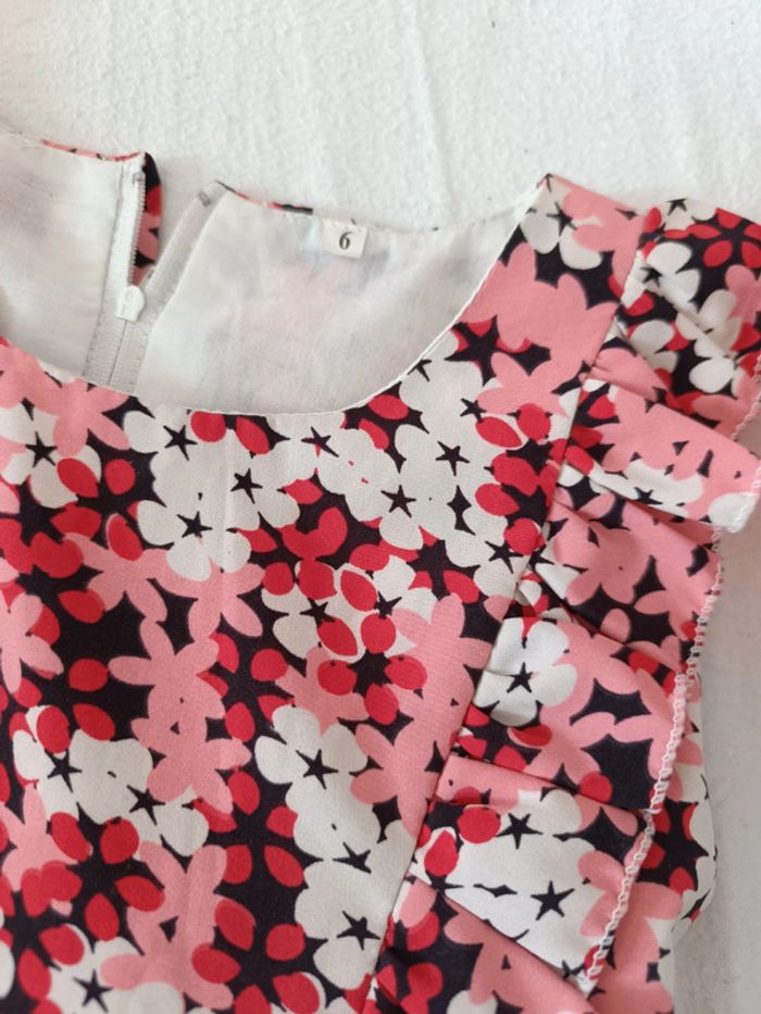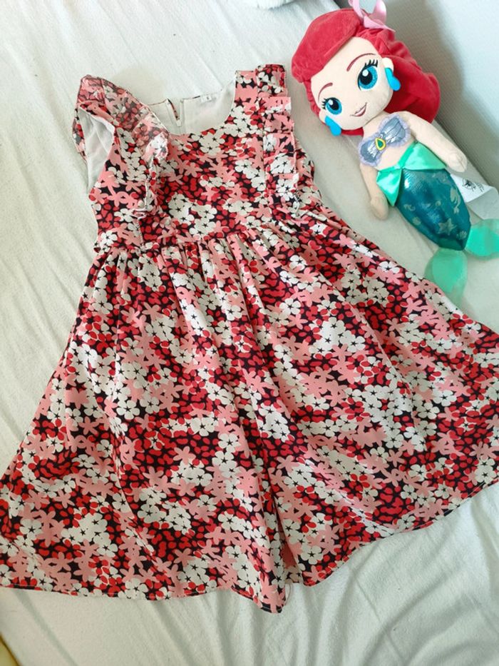 Robe été fleurie dans les tons rouges et roses. Détails aux manches et ceinture à nouer dans le dos. Fermeture par un Zip dans le dos Taille 6 ans. Maison non fumeur sans animaux.