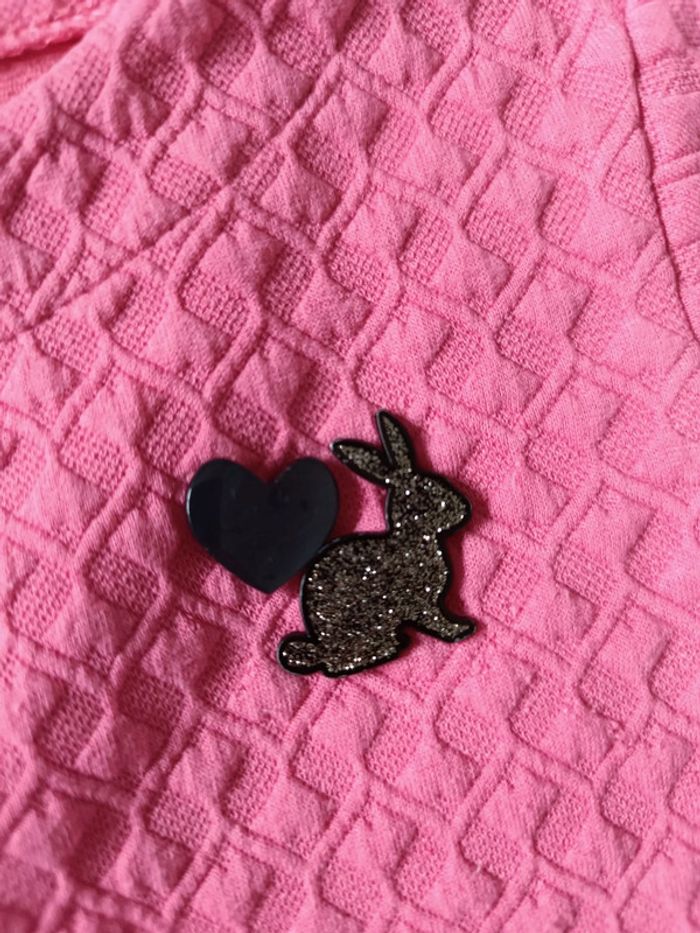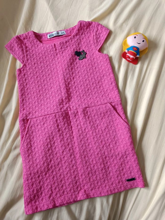Robe rose tissus gaufré Lola Lisa 2 poches. Cœur et lapin cousus. Taille 110/116 cm