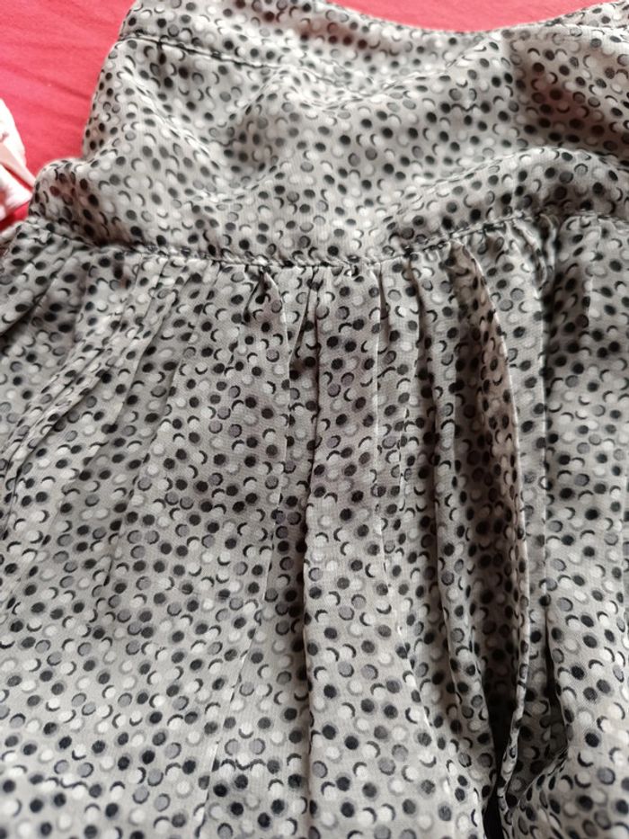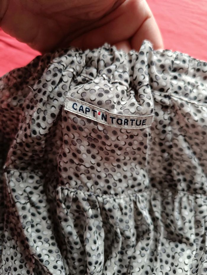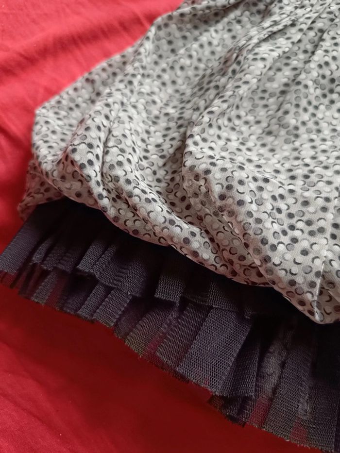 Jupe grise de chez Capt' tortue. Tissus très léger et effet boule. Bord en tulle noir. Taille réglable. Taille 128