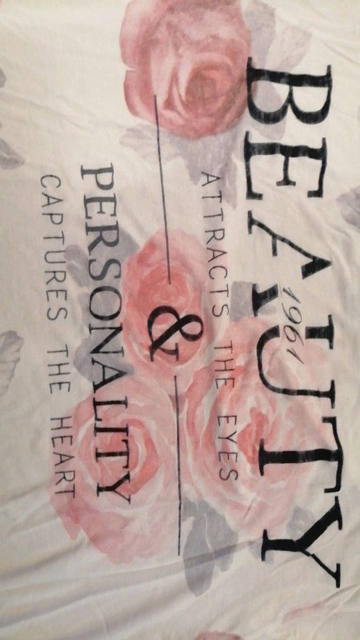 T-shirt, à fleur rose, à ligne et écriture bleu