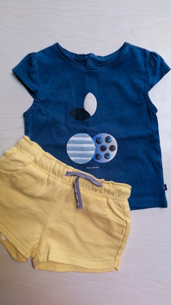 Ensemble 2 pièces de chez Obaibi T-shirt avec fermeture à pressions dans le dos et short à taille élastique. Taille 6 mois, 68cm #aurelieetfred6mois