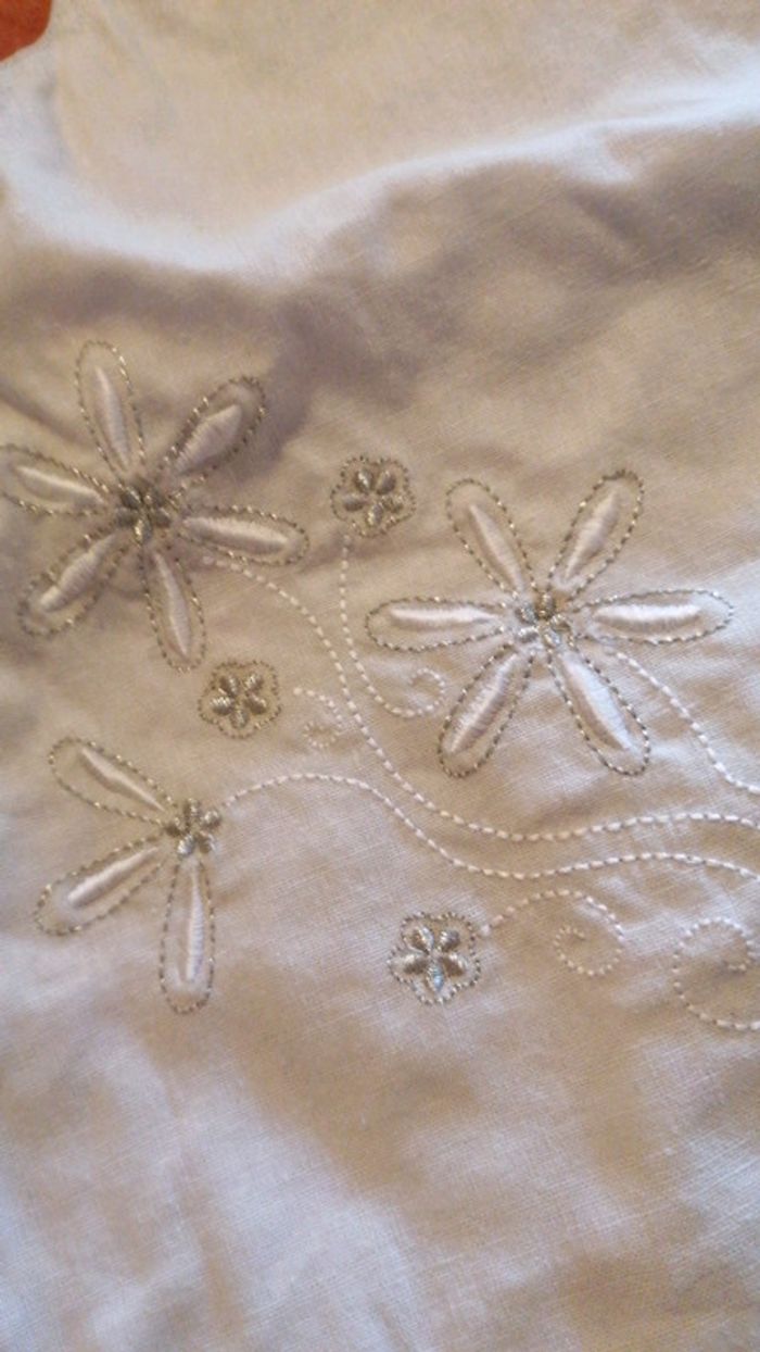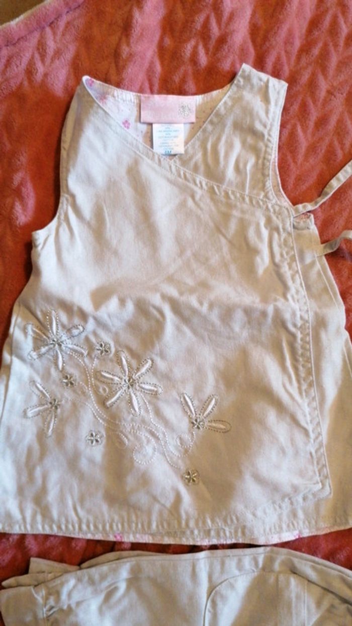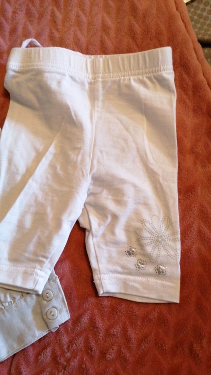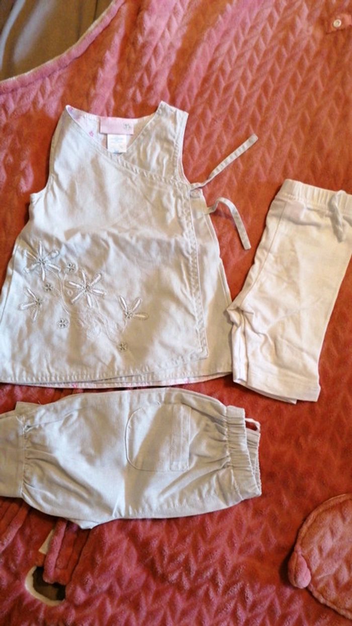 Ensemble 3 pièces composé D'une robe gris clair cache cœur avec broderie fil blanc et doré Un legging court blanc avec motif qui rappelle les broderies de la robe Un pantalon 3/4 dans le même tissus que la robe Taille 6 mois, 68 cm Consultez mes autres articles en 6 mois #aurelieetfred6mois