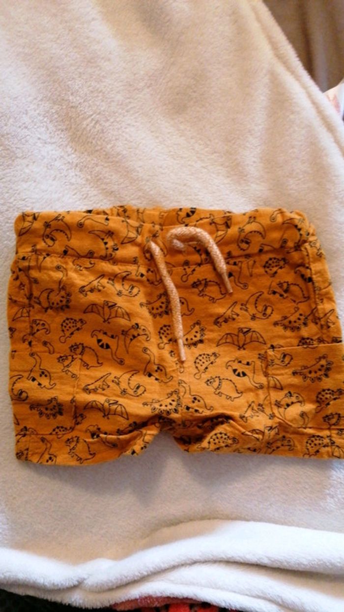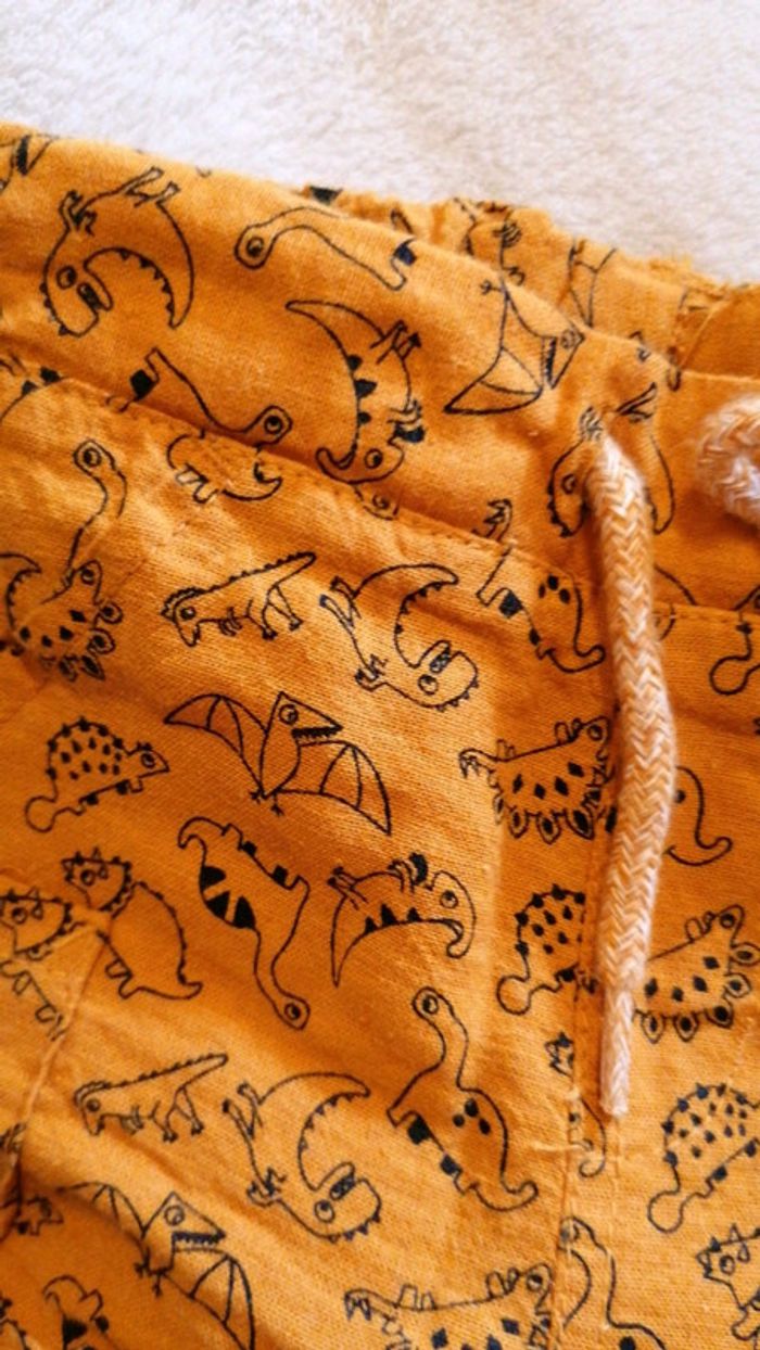 Short moutarde avec motifs de dinosaures. Lavé mais jamais porté. Taille 6 mois, 63/69 cm Consultez mes autres articles en 6 mois #aurelieetfred6mois