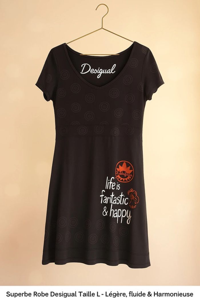 🌟 **Superbe Robe Desigual Taille L - Légère, Fluide & Harmonieuse** 🌟 Ajoutez une touche de fantaisie à votre dressing avec cette magnifique robe Desigual en taille L. ✨ **Caractéristiques :** - **Style** : Élégante et fluide, parfaite pour un look tendance et confortable - **Motifs** : Noir avec imprimés circulaires subtils - **Détails uniques** : Col en V - **Message inspirant** : “Life is fantastic & happy” inscrit sur le bas 💃 Une robe idéale pour toutes les saisons, qui allie originalité et confort. 📌 **État** : Très bon, peu portée 📦 **Livraison** : Disponible via Vinted Faites-vous plaisir avec cette pièce unique ! ✨ #Desigual #RobeOriginale #StyleFluide #ModeFéminine #SecondeMain