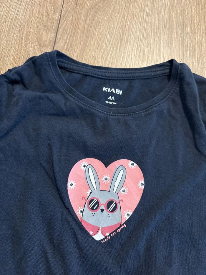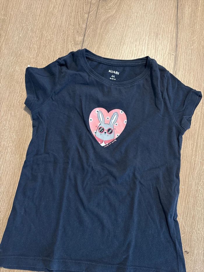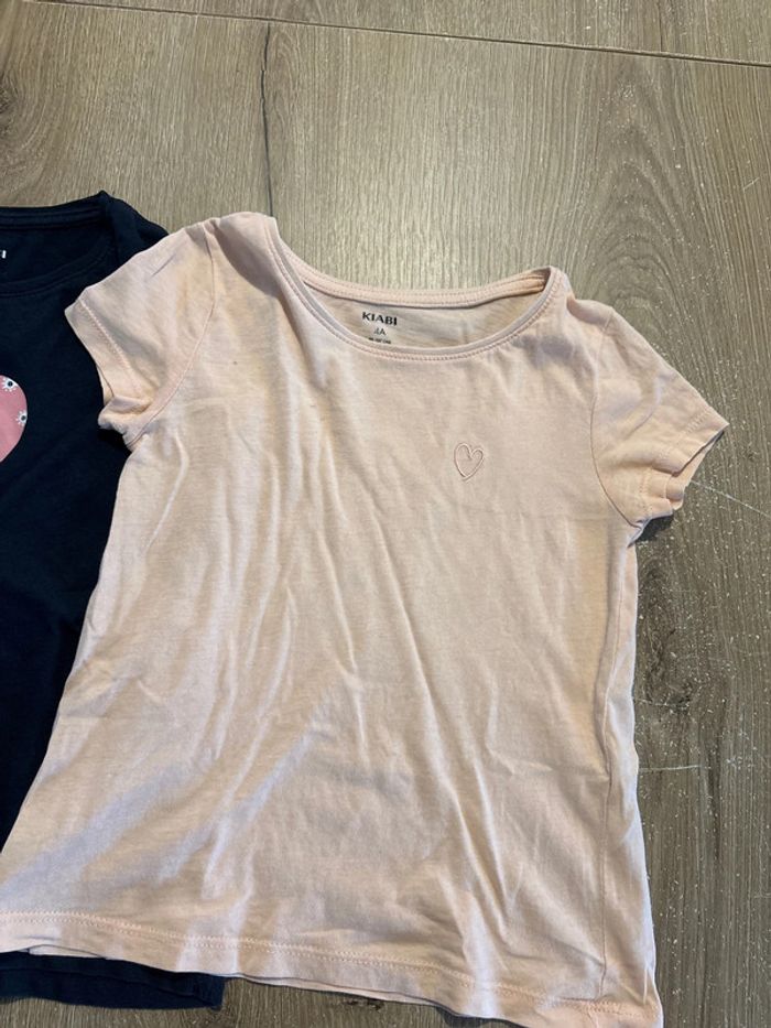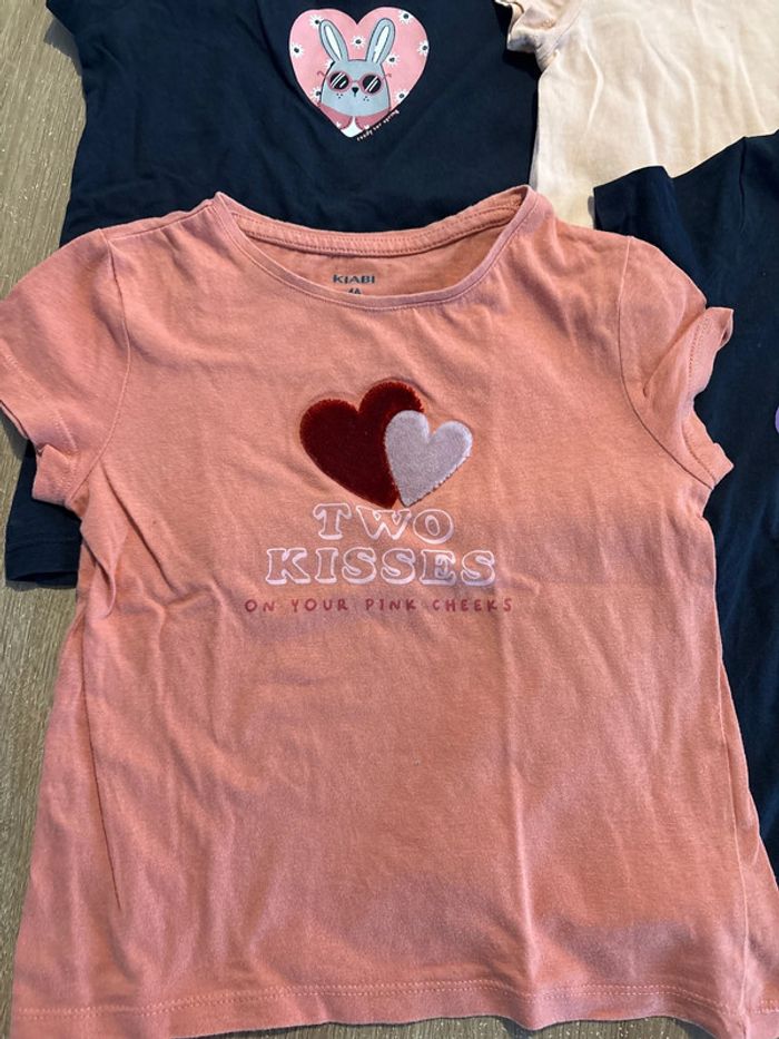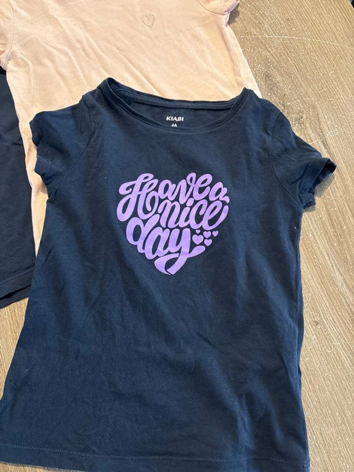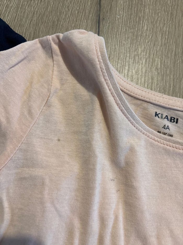 Lot de 4 tee shirt 1 rose foncé (1 marque de feutre dans une lettre) 2 bleus marine en parfait état 1 rose clair avec petite tache peu visible Kiabi 4 ans