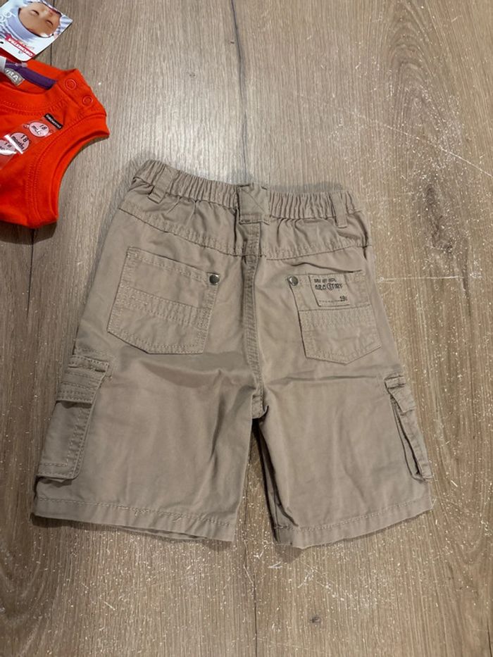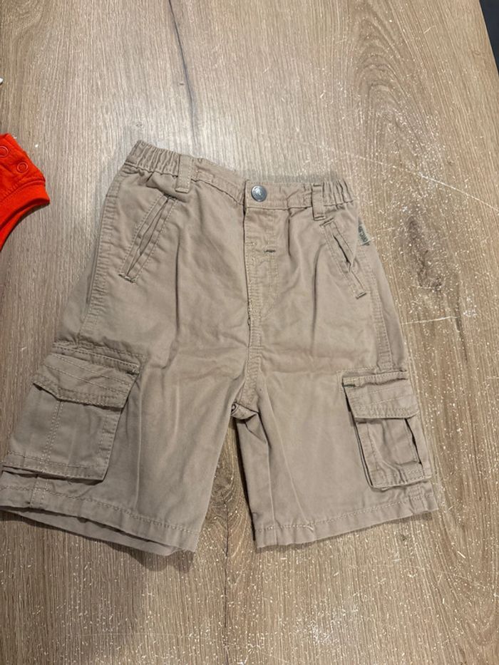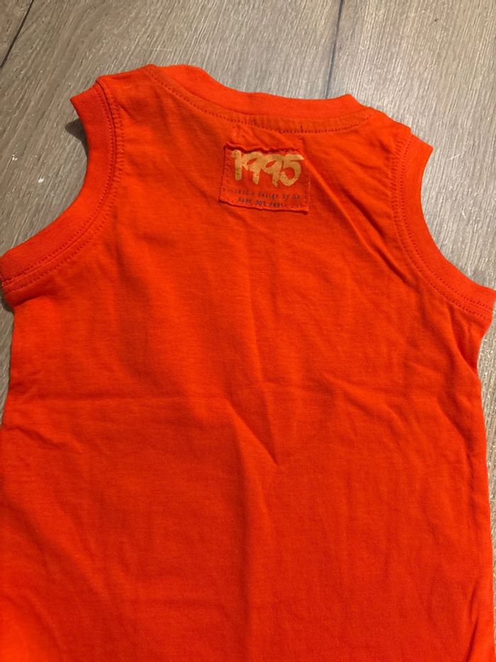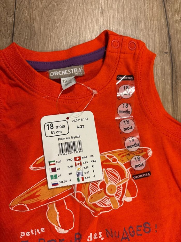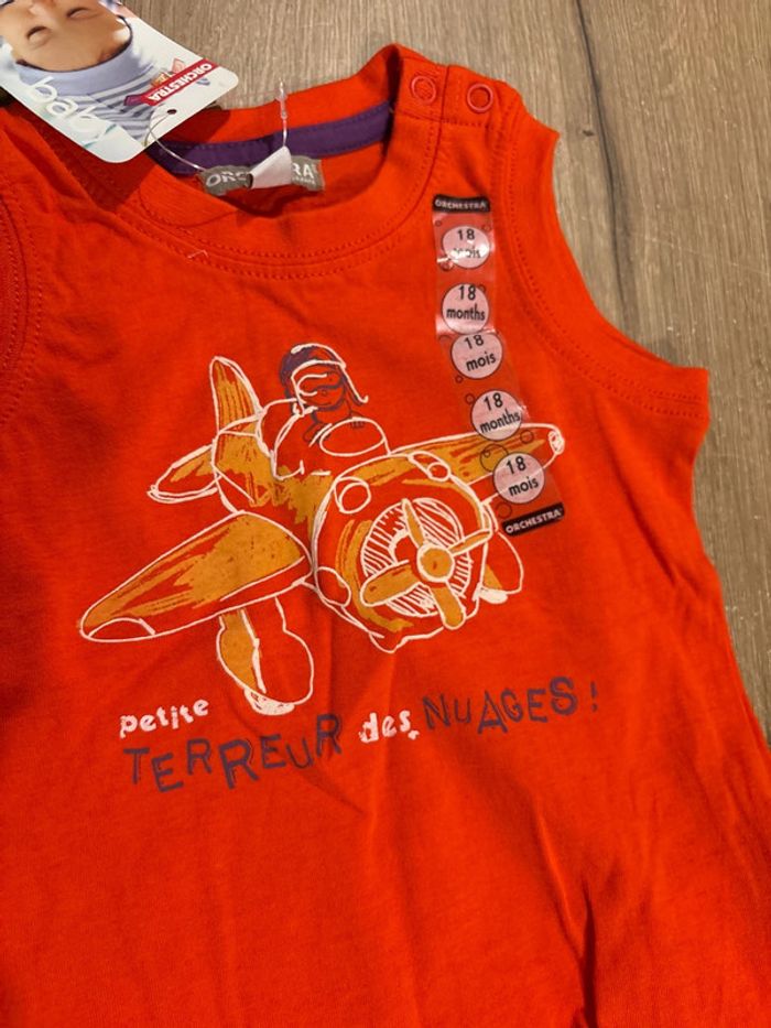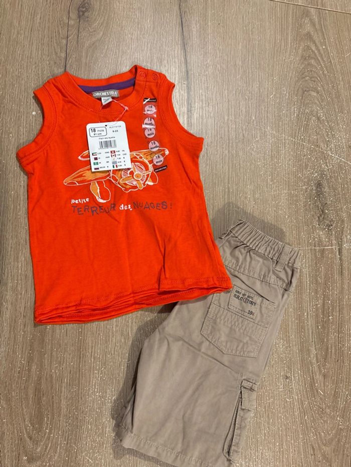 Un débardeur orange neuf Un short marron beige porté 1 fois Taille 18 mois Orchestra