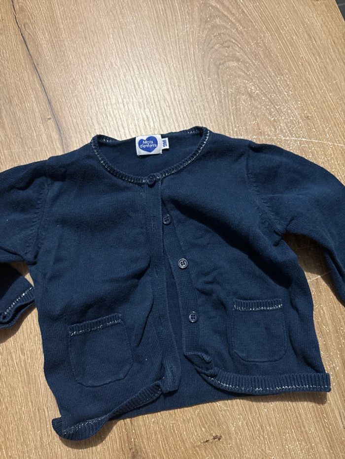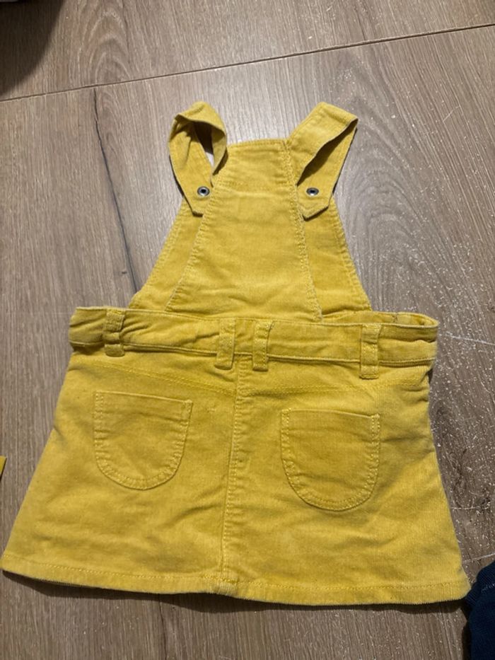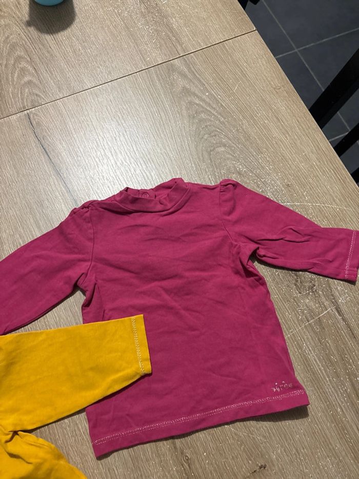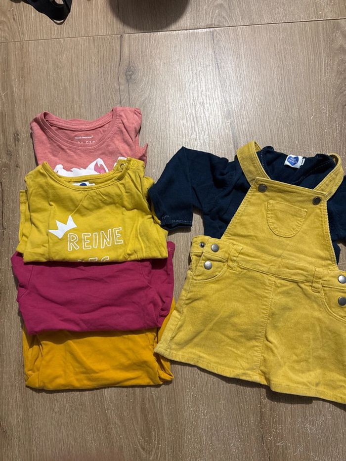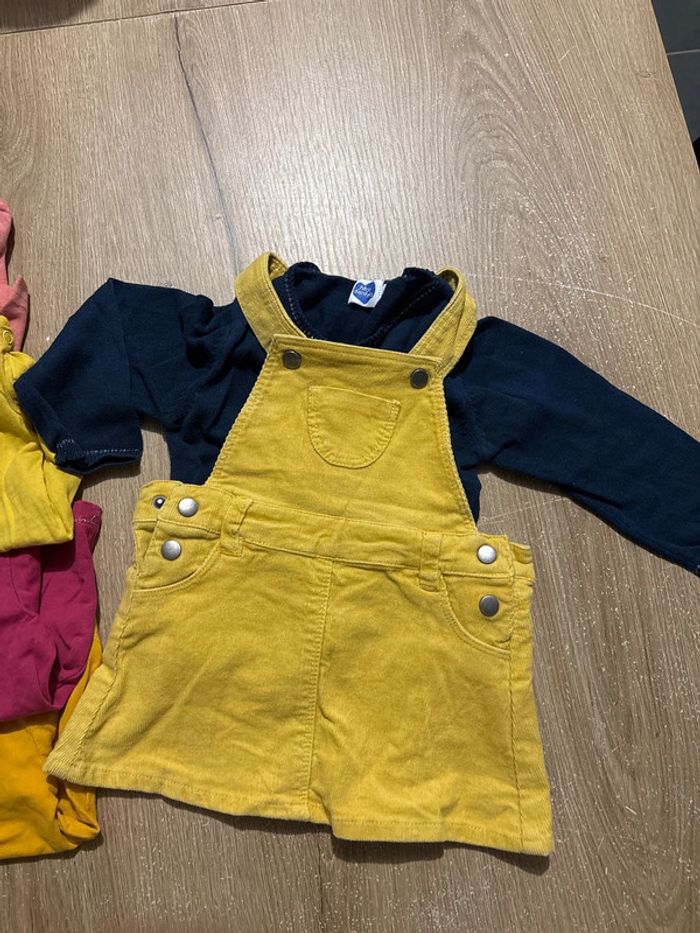 Lot avec 1 robe velours jaune, 1 gilet bleu marine, 4 hauts manche longue Le tout en parfait état 9 mois Mot d enfants et orchestra
