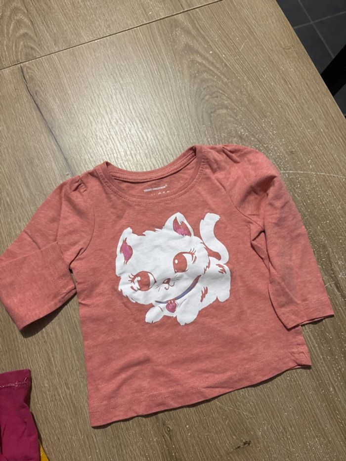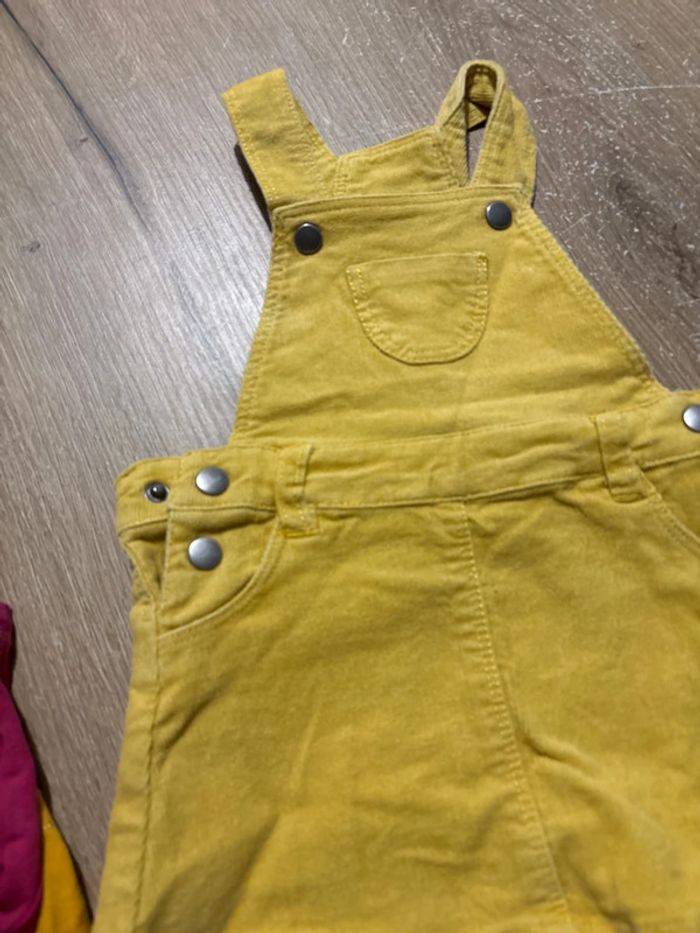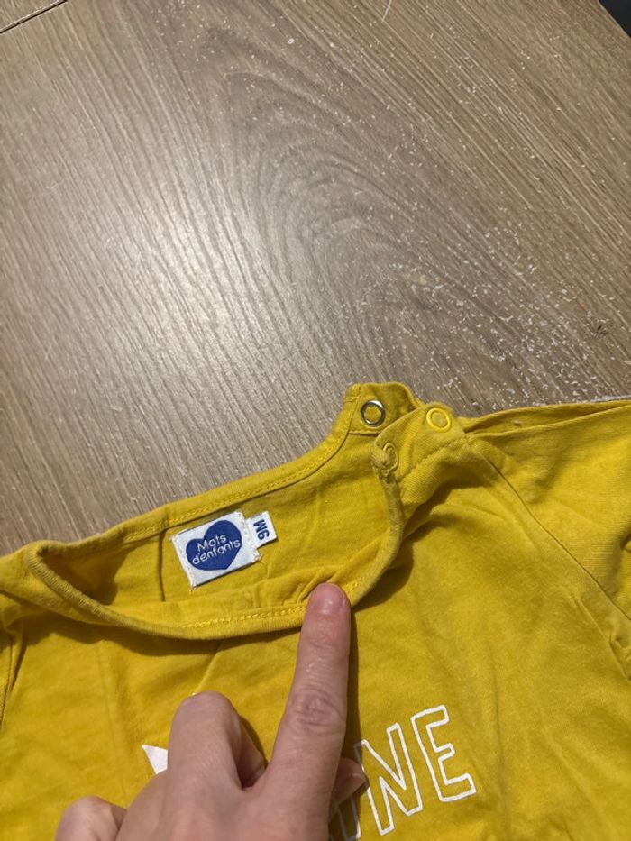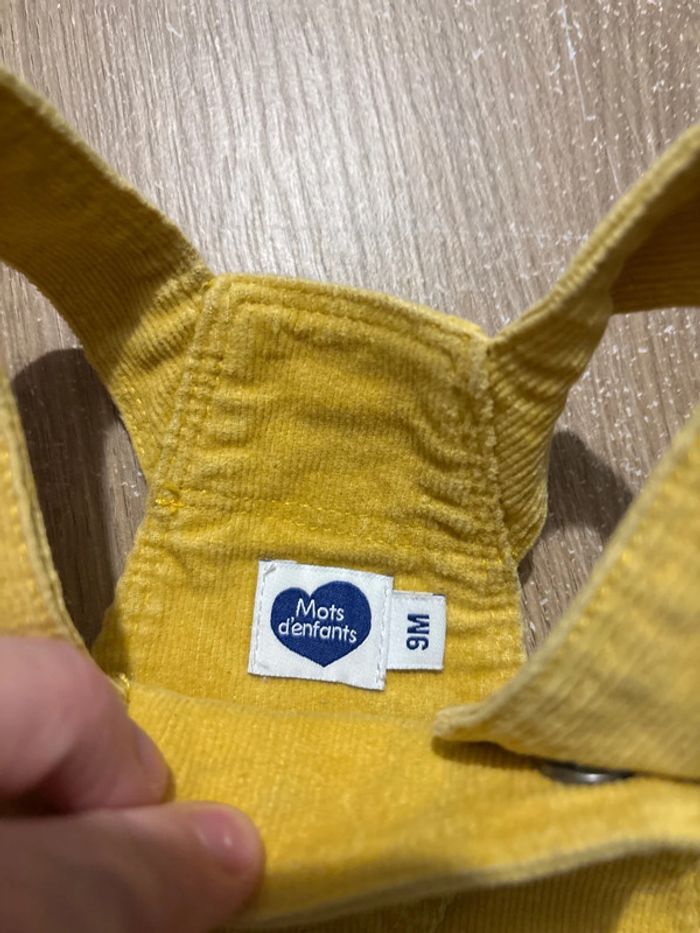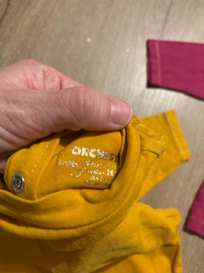 Lot avec 1 robe velours jaune, 1 gilet bleu marine, 4 hauts manche longue Le tout en parfait état 9 mois Mot d enfants et orchestra