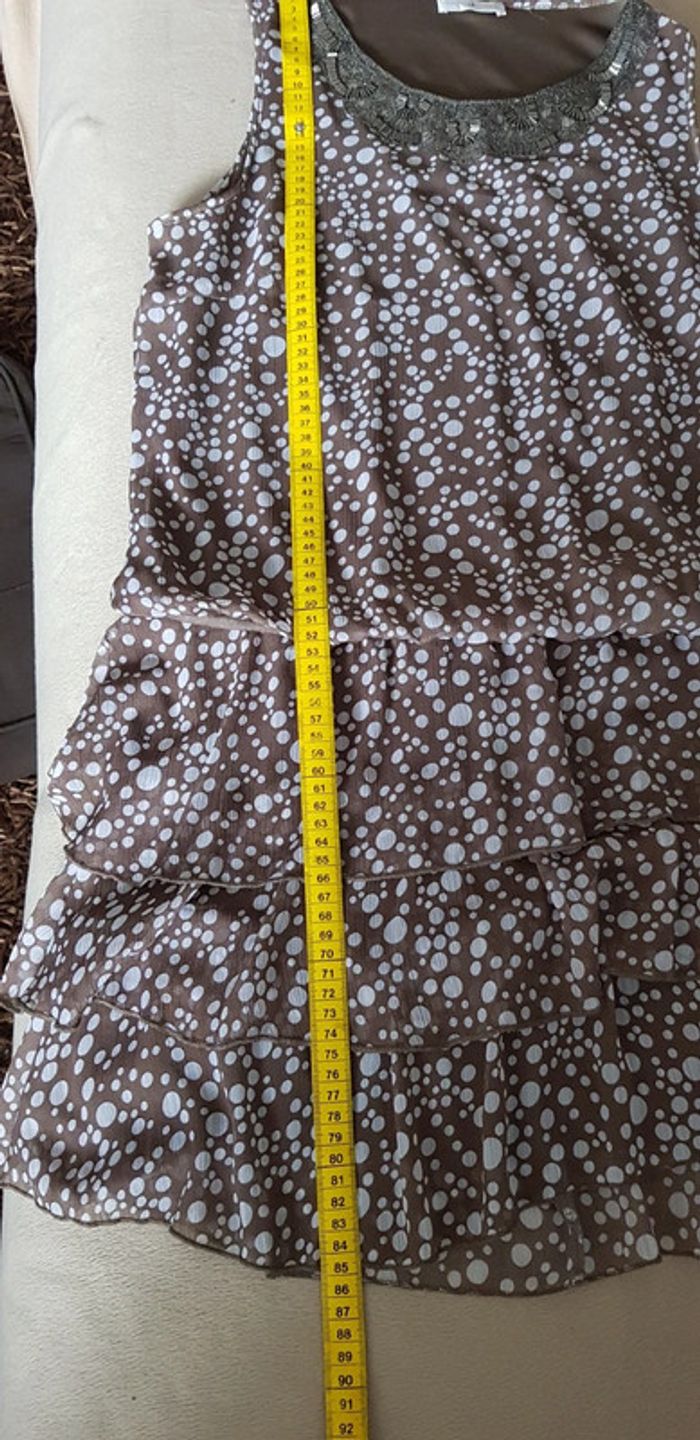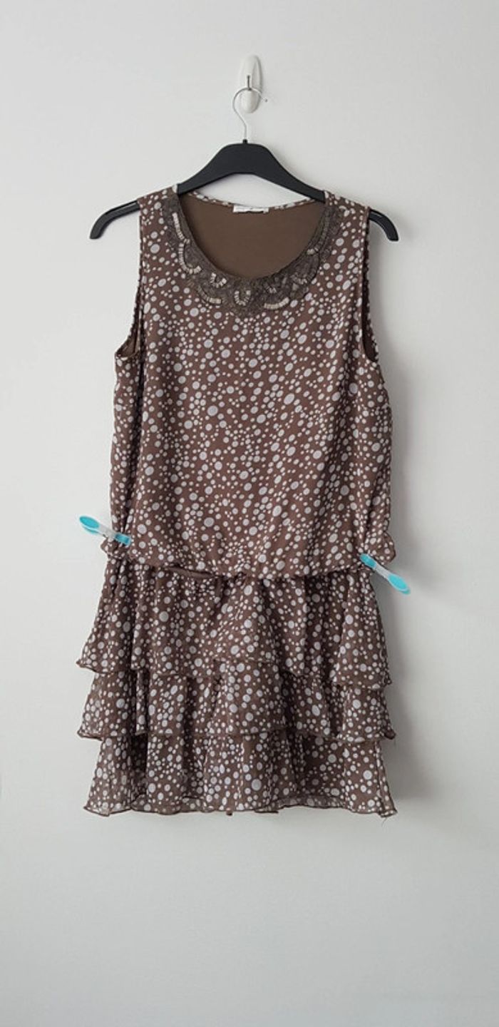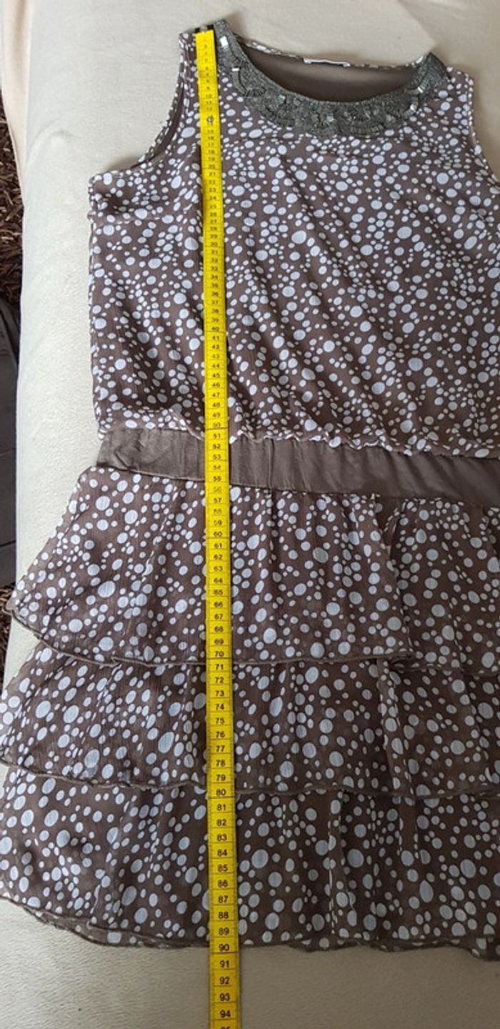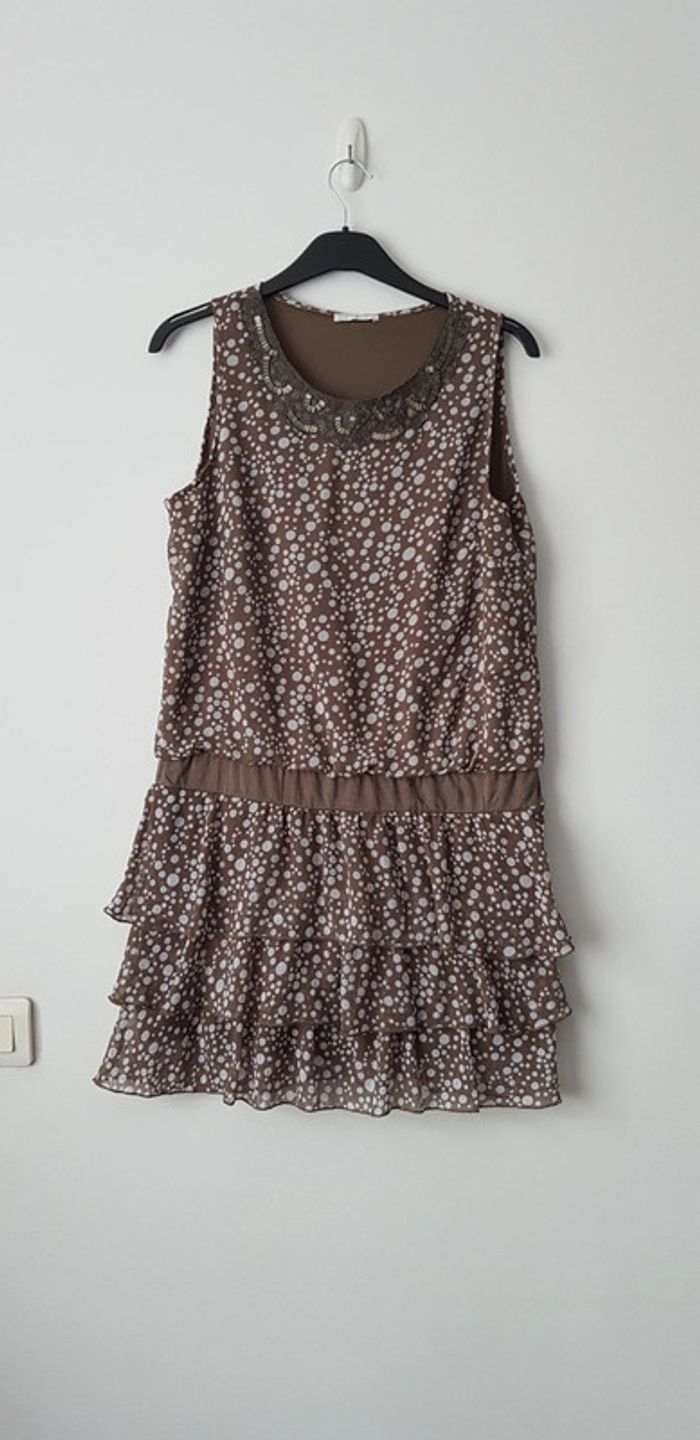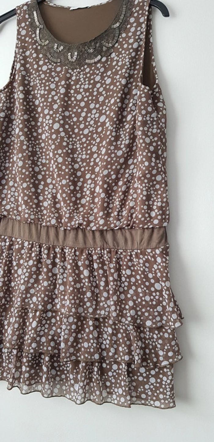 Robe courte et légère sans manches marron à pois gris, plusieurs volants, bande un peu élastiquée à la taille pour un superposition de la partie du haut. Col rond avec dentelle et orné de petites perles de riz - T. 40 - TRÈS BON ÉTAT. #alupinerobejupefemmetaille40 #robefemme40 #robelegerefemme40 #robecourtefemme40 #robesansmanchesfemme40 #robecachecachefemme40 #robeetefemme40 #robeetecachecachefemme40 #cachecachefemme40 #cachecache