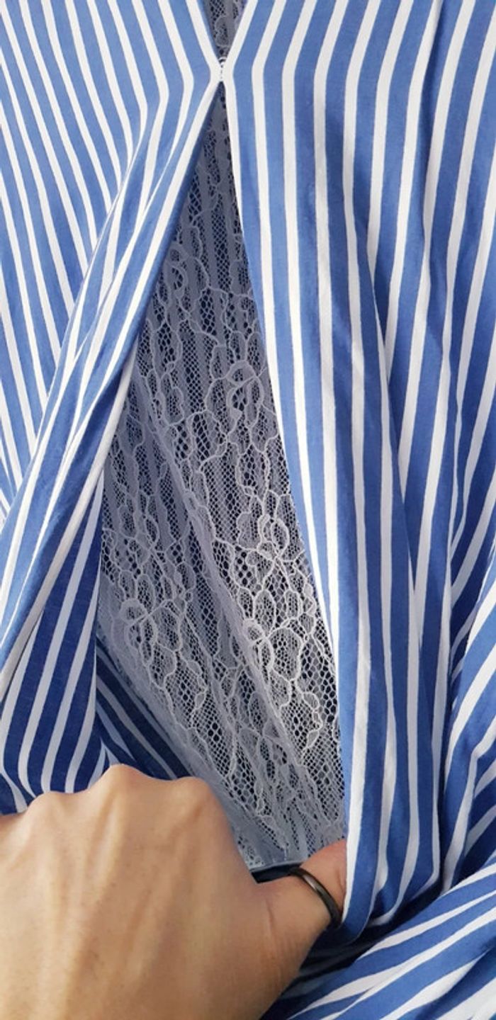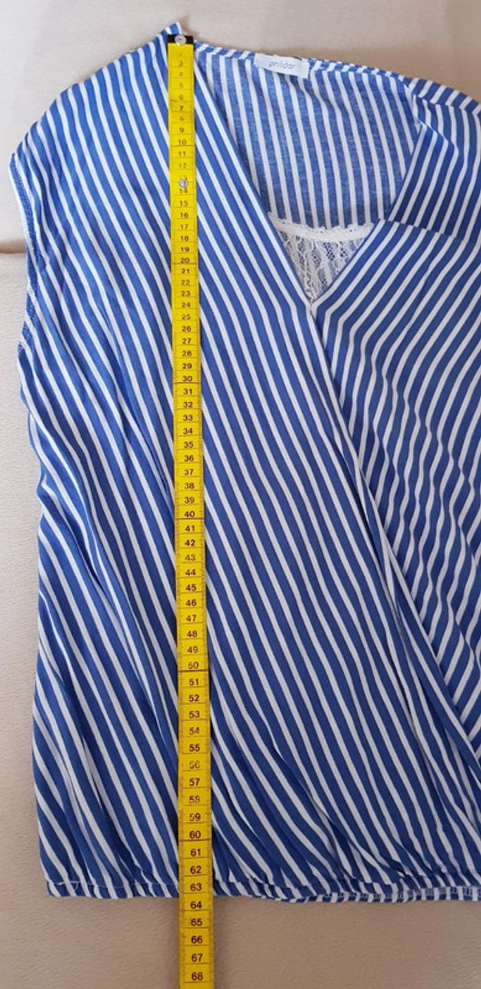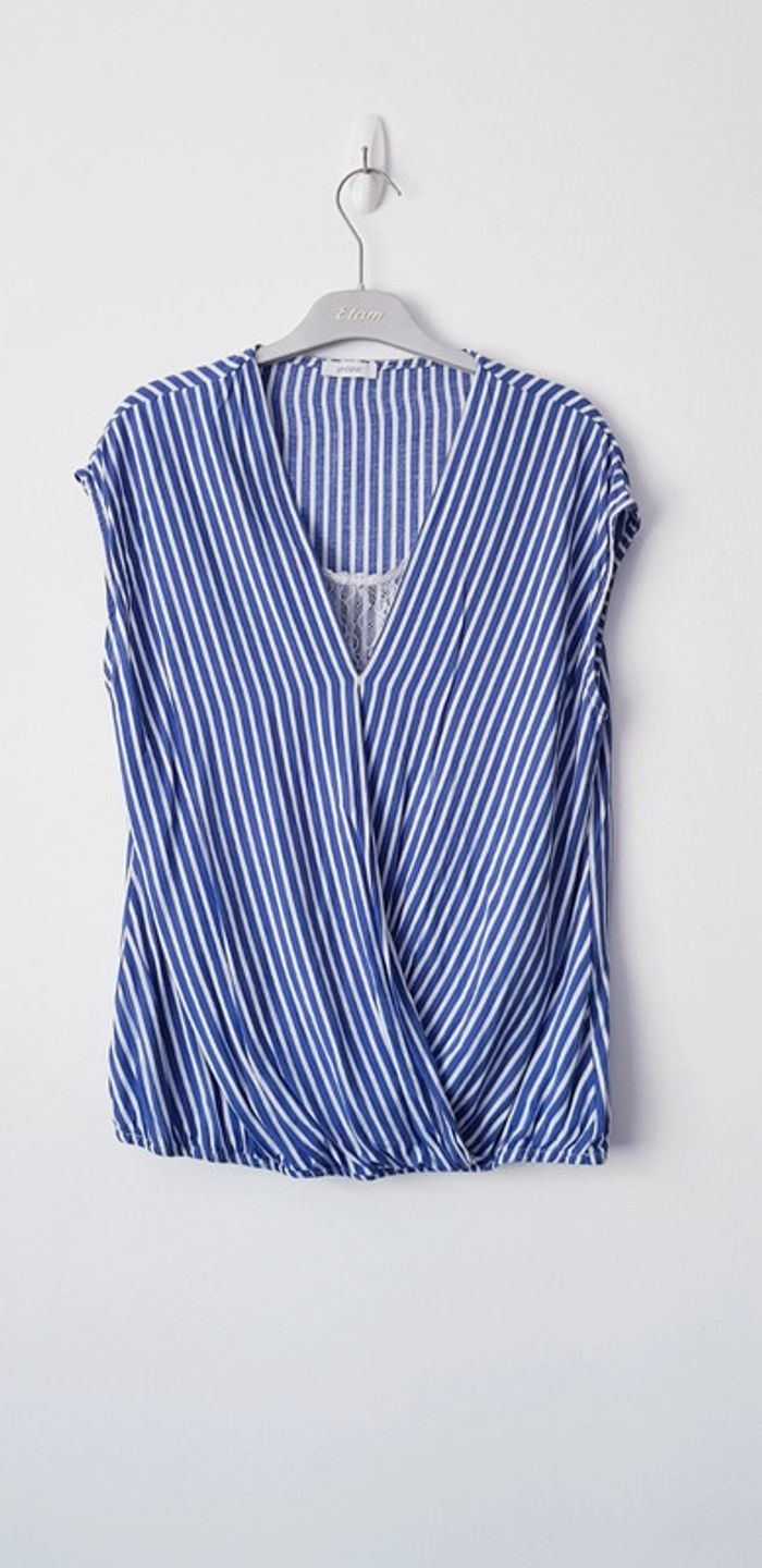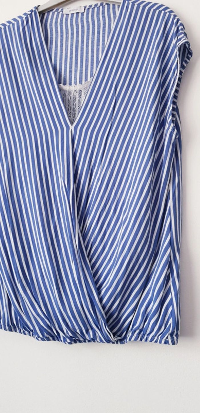 Haut croisé manches courtes à rayures blanches et bleues, intérieur panneau en dentelle et taille élastiquée - T. 38 - TRÈS BON ÉTAT. #alupinehautfemme38 #alupineteeshirtfemme38 #hautfemme38 #hautmanchescourtesfemme38 #hautcroisefemme38 #hautmanchescourtesphildarfemme38 #hautphildarfemme38 #teeshirtfemme38 #teeshirtmanchescourtesfemme38 #teeshirtphildarfemme38 #blousefemme38 #blousemanchescourtesfemme38 #blousephildarfemme38 #phildarfemme38 #phildar