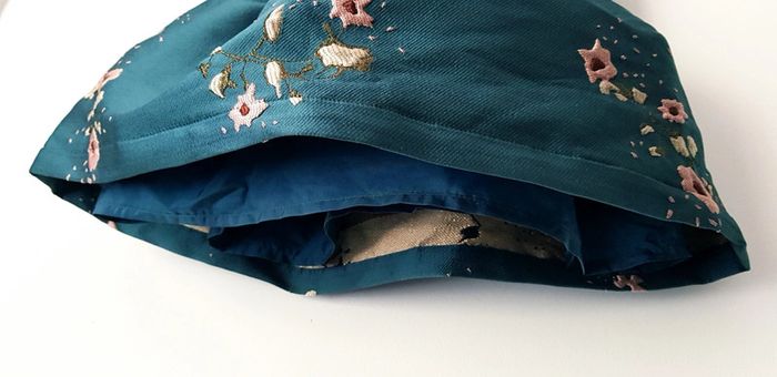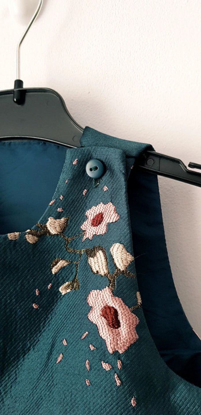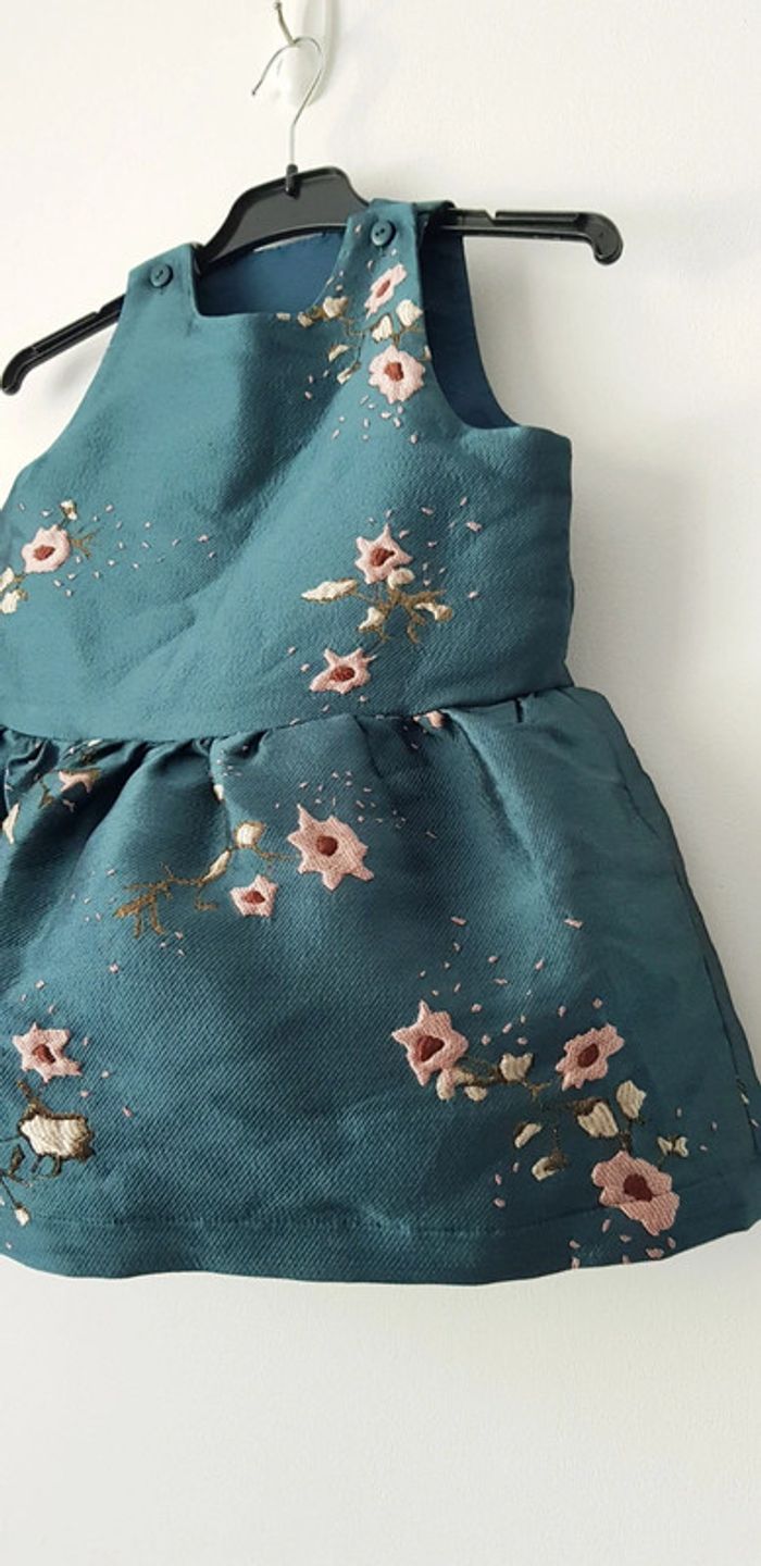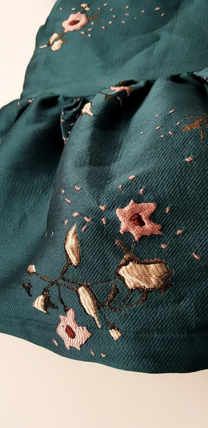 Robe vert foncé reflet satin aux motifs floraux brodés, ouverture bouton sur les bretelles et effet ballon - T. 4 ans - TRÈS BON ÉTAT. #alupinerobejupefille4ans #robefille4ans #robebretellesfille4ans #robeballonfille4ans