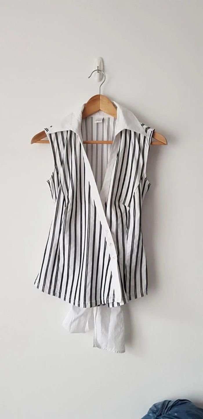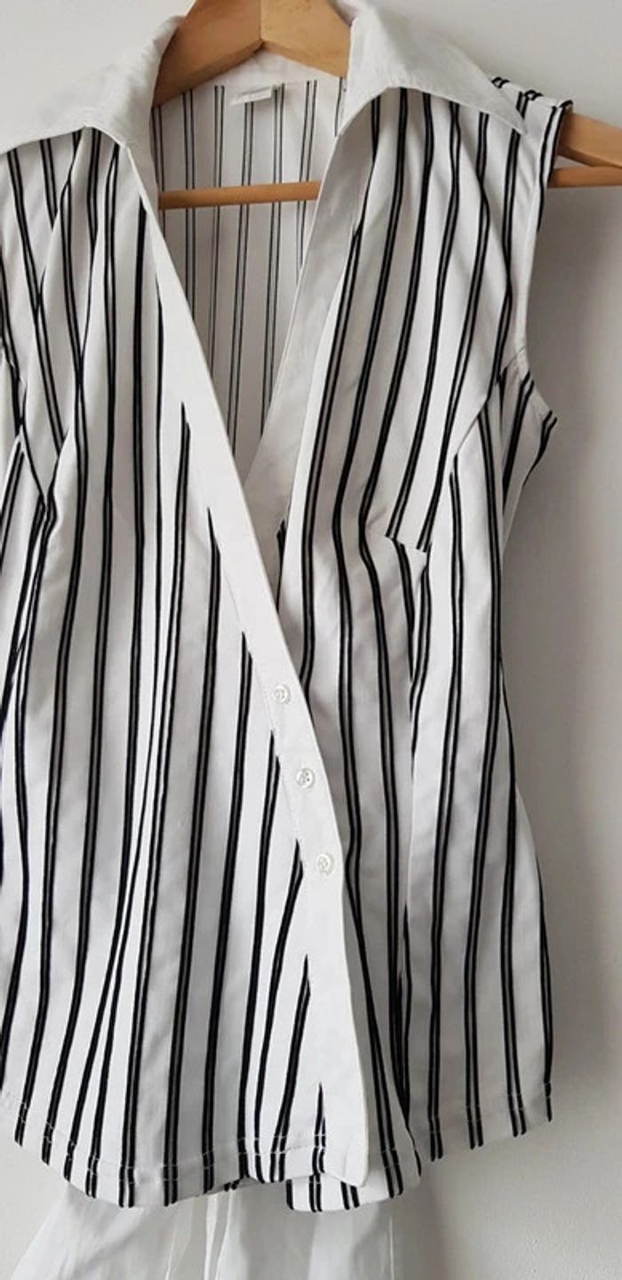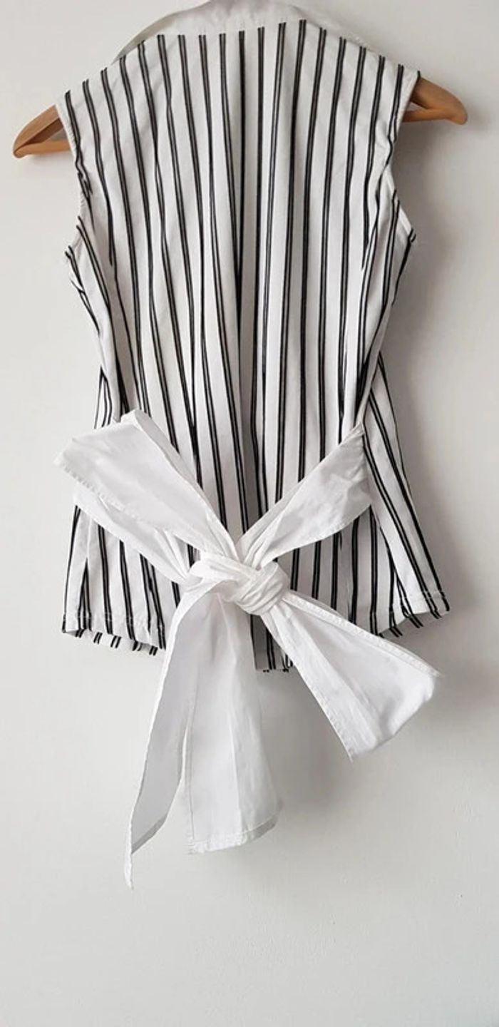 Chemise sans manches style cache-coeur blanc à rayures noires avec un laçage dans le dos - T. 40 - TRÈS BON ÉTAT COMME NEUVE. #alupinehautfemmetaille40 #alupinechemisefemme40 #hautfemme40 #chemisefemme40 #hautsansmanchesfemme40 #chemisemanchescourtesfemme40 #cachecoeurfemme40 #cachecoeursansmanchesfemme40 #hautsansmanchescamaieufemme40 #chemisesansmanchescamaieufemme40 #cachecoeursansmanchescamaieufemme40 #camaieufemme40 #camaieu